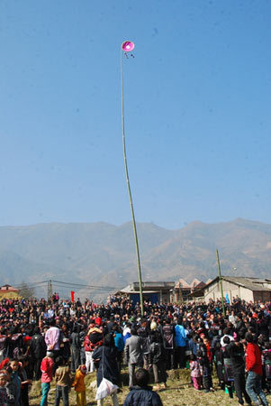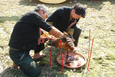 Hội diễn ra trên bãi đất bằng phẳng ngay cạnh đường cái, nổi bật là cây nêu cao vút làm bằng cây bương già, trên ngọn treo vòng tròn, dán giấy đỏ tượng trưng vầng nhật nguyệt. Mở đầu, thầy mo làm các nghi thức cúng trời đất thông qua các điệu nhảy, bài khấn và cắt tiết gà.
