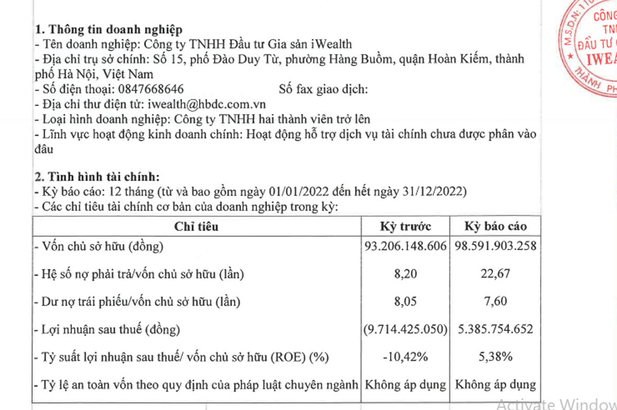 Năm 2022, iWealth có lãi gần 5,4 tỷ đồng, so với mức lỗ hơn 9,7 tỷ đồng trong năm 2021. Tỷ suất lợi nhuận sau thuế trên vốn chủ sở hữu (ROE) là 5,38%, so với mức -10,42% năm 2021.