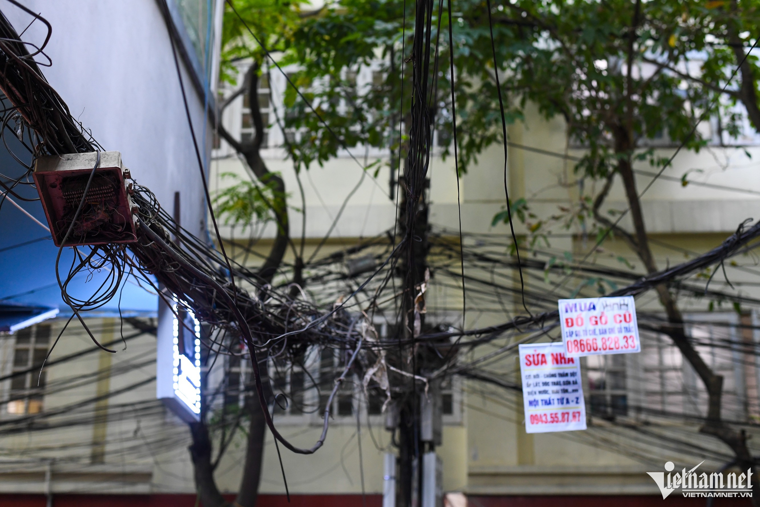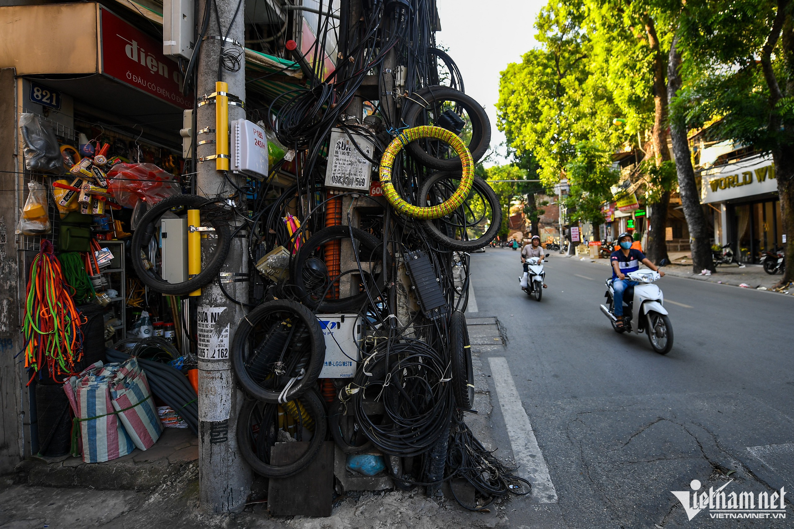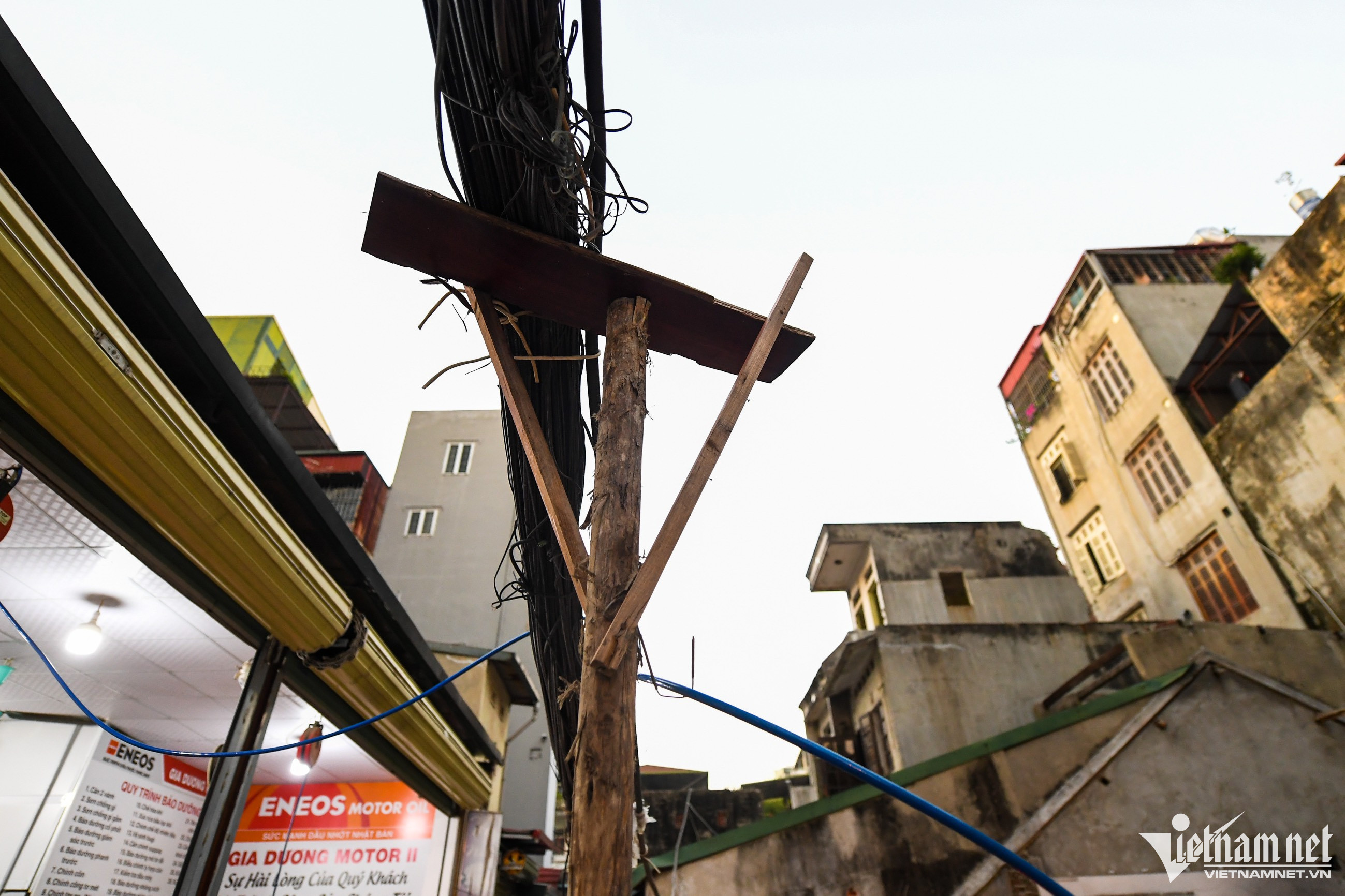 Một hộ kinh doanh dùng cột gỗ thô sơ chống đỡ tạm bợ.Trên phố Thành Công (quận Ba Đình) dây điện và cáp viễn thông võng xuống ngay tại vỉa hè.Ô điện nằm lộ thiên xuất hiện phổ biến tại nhiều khu dân cư.Một hộ kinh doanh trên đường Đê La Thành (quận Đống Đa) tận dụng cột điện phía trước nhà treo nhiều lốp xe, gây cảm giác rùng mình cho nhiều người.