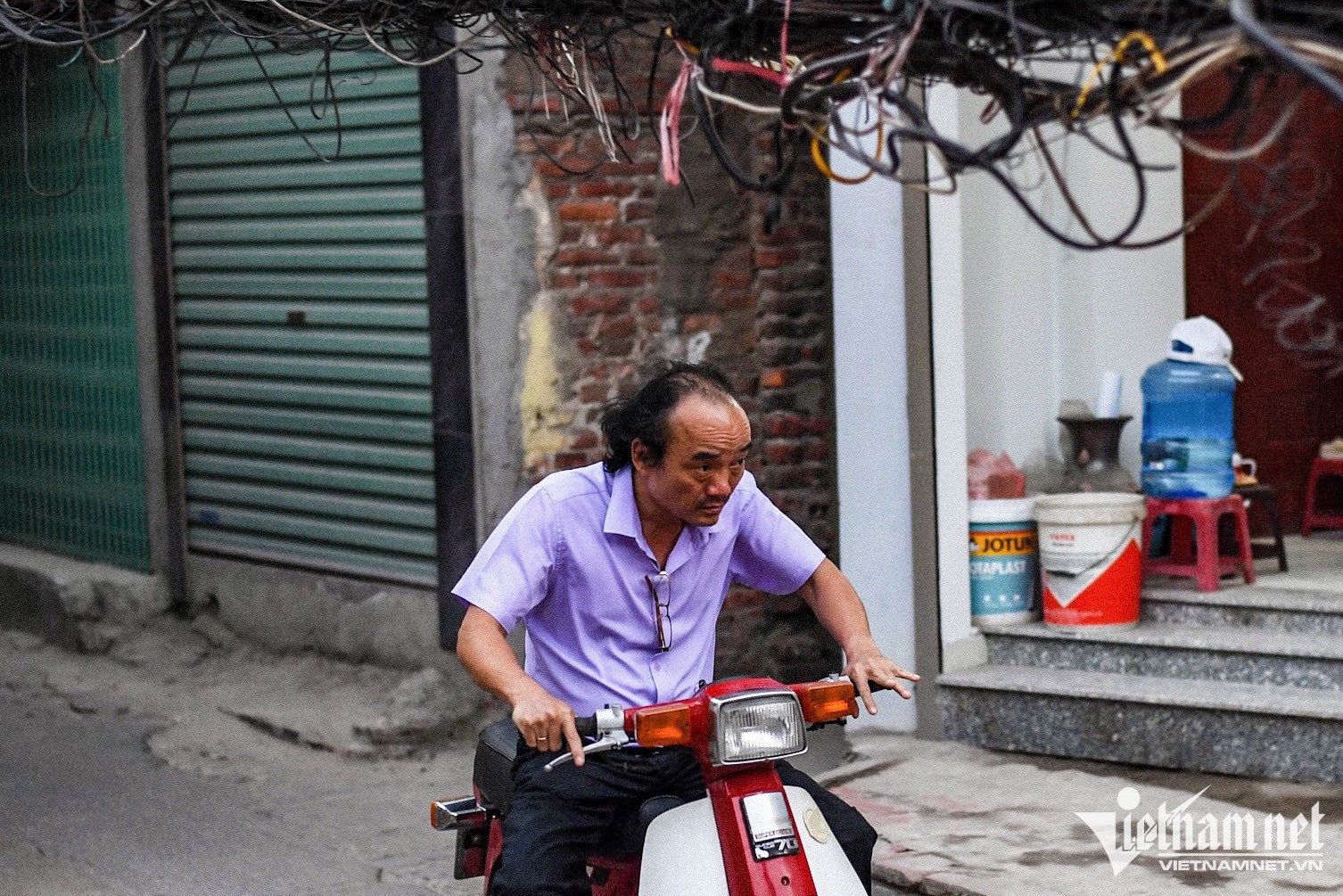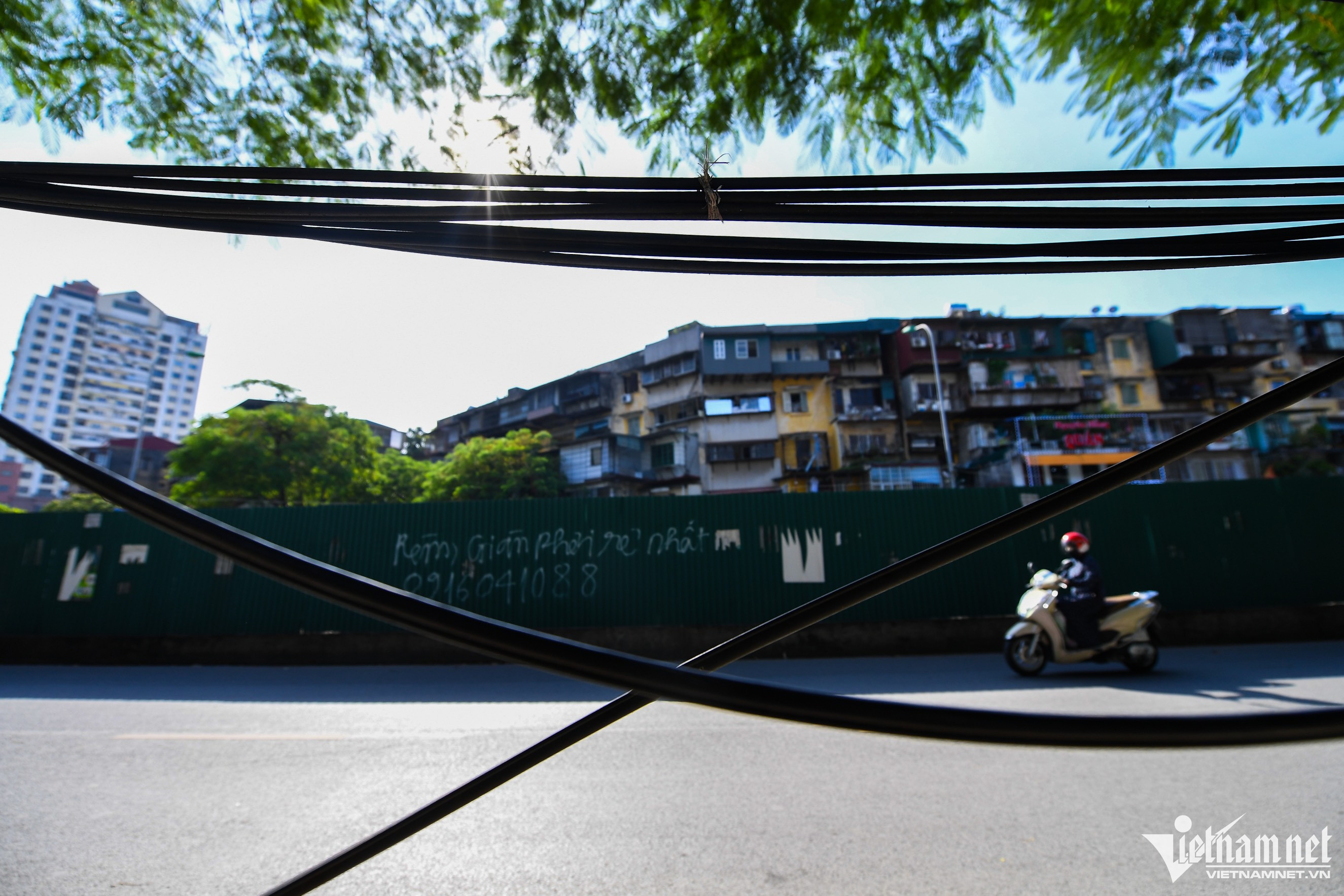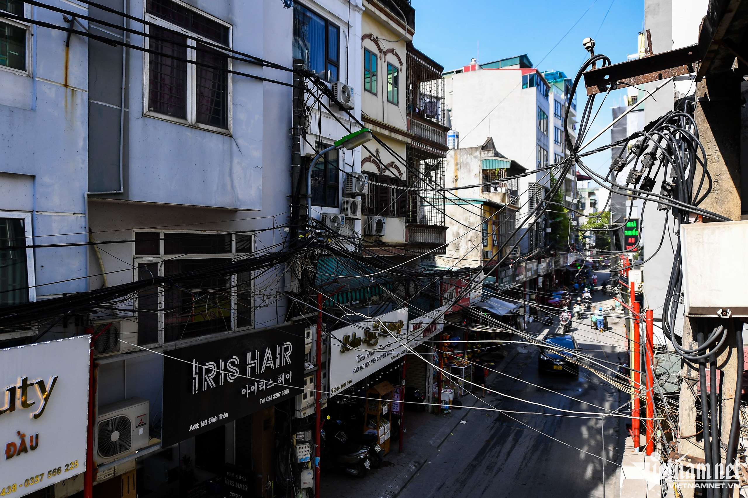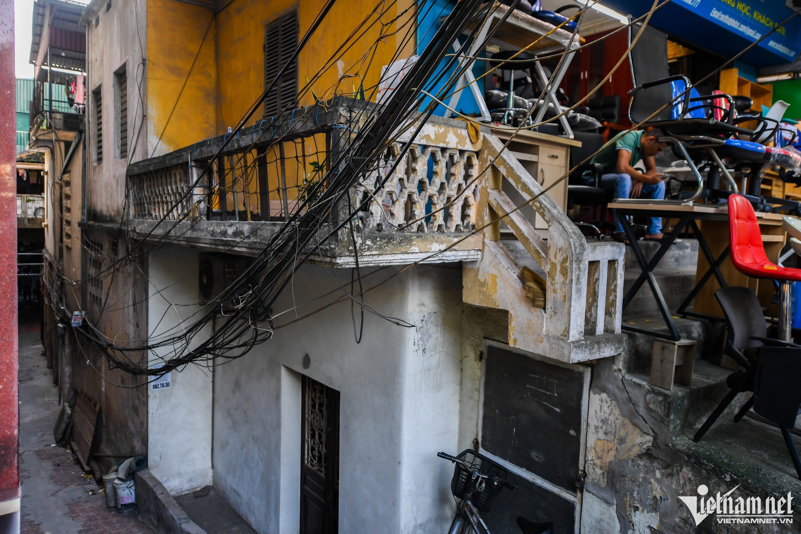 Một hộ kinh doanh dùng cột gỗ thô sơ chống đỡ tạm bợ.Trên phố Thành Công (quận Ba Đình) dây điện và cáp viễn thông võng xuống ngay tại vỉa hè.Ô điện nằm lộ thiên xuất hiện phổ biến tại nhiều khu dân cư.Một hộ kinh doanh trên đường Đê La Thành (quận Đống Đa) tận dụng cột điện phía trước nhà treo nhiều lốp xe, gây cảm giác rùng mình cho nhiều người.