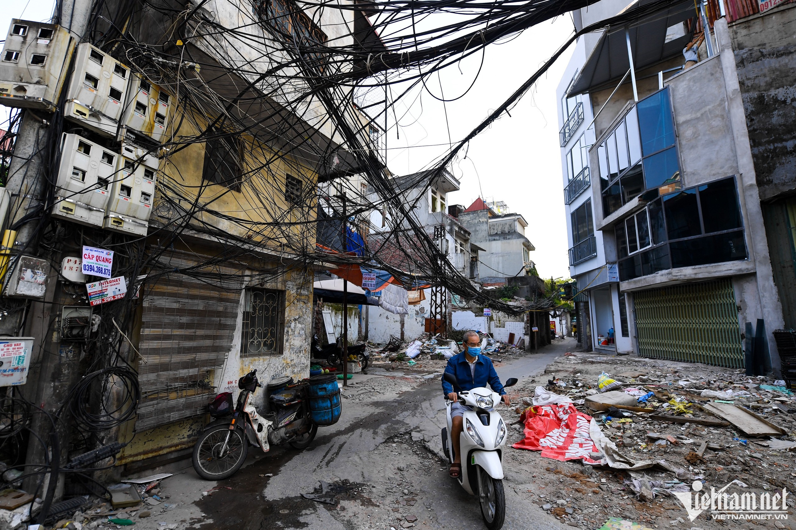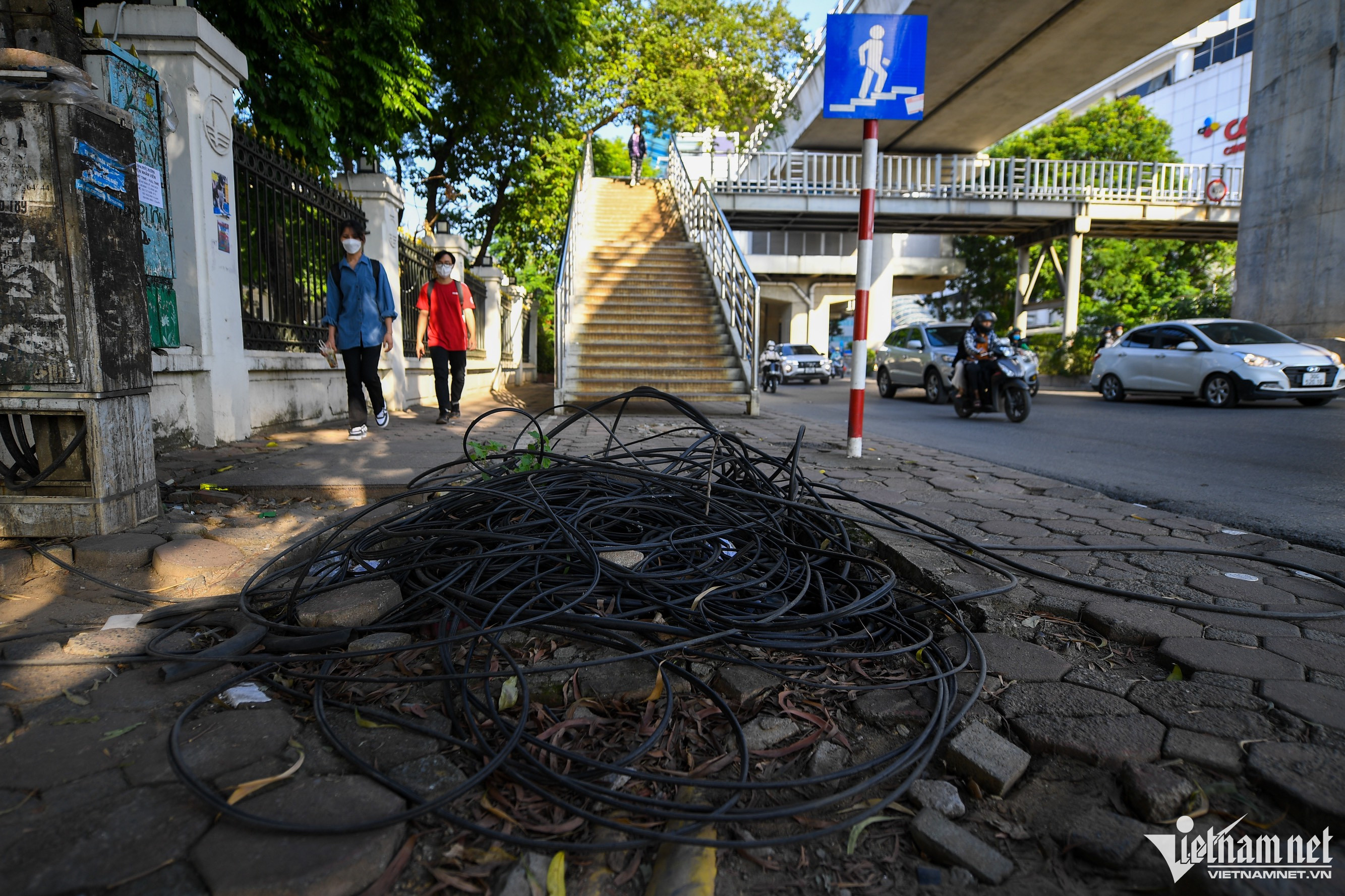 Các đường dây điện, cáp viễn thông chằng chéo rối như tơ vò vẫn xuất hiện ở nhiều tuyến đường như Đê La Thành, Thành Công, Đình Thôn, ảnh hưởng đến mỹ quan đô thị cũng như an toàn của người dân sống xung quanh.Tại ngõ 102 Trường Chinh (quận Đống Đa), có nhiều đoạn dây điện, dây cáp bị đứt gãy.