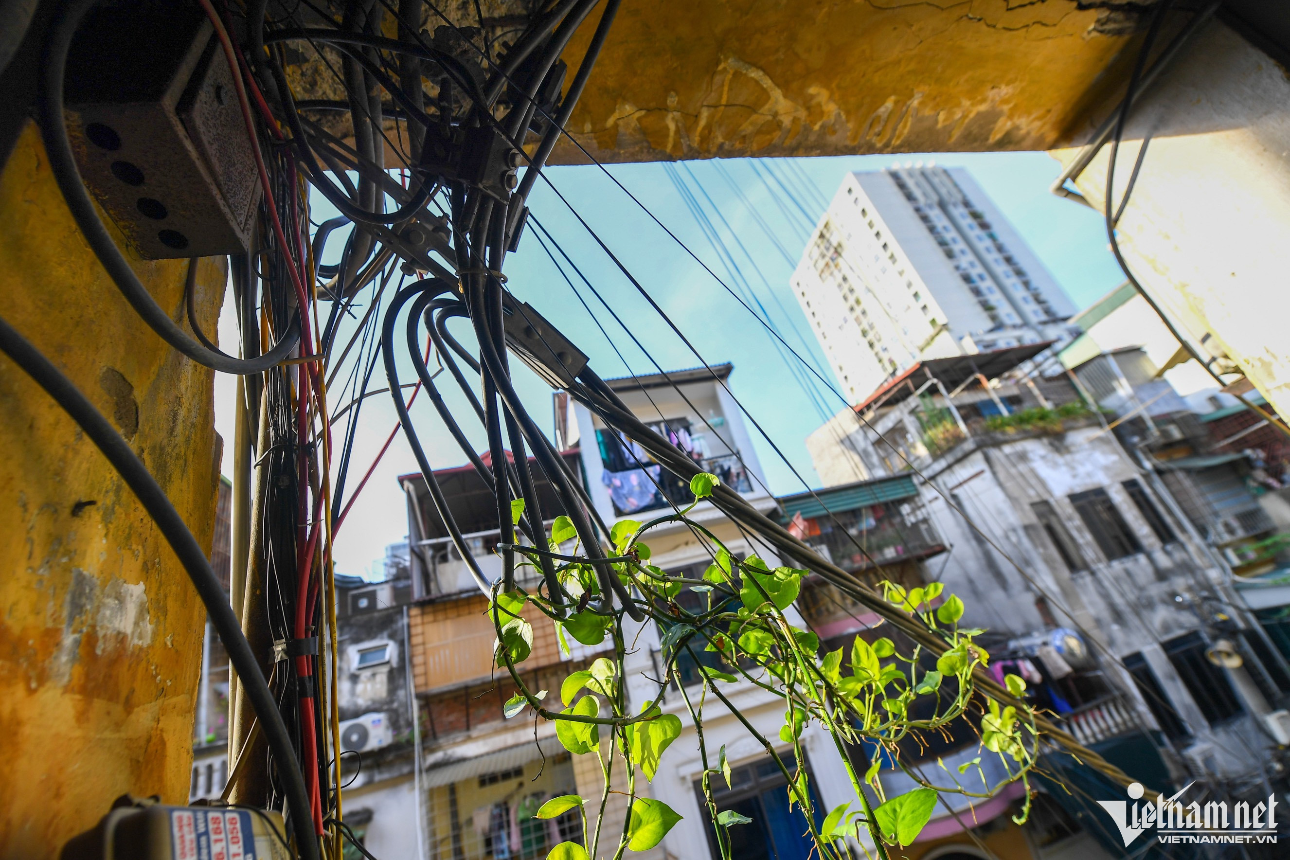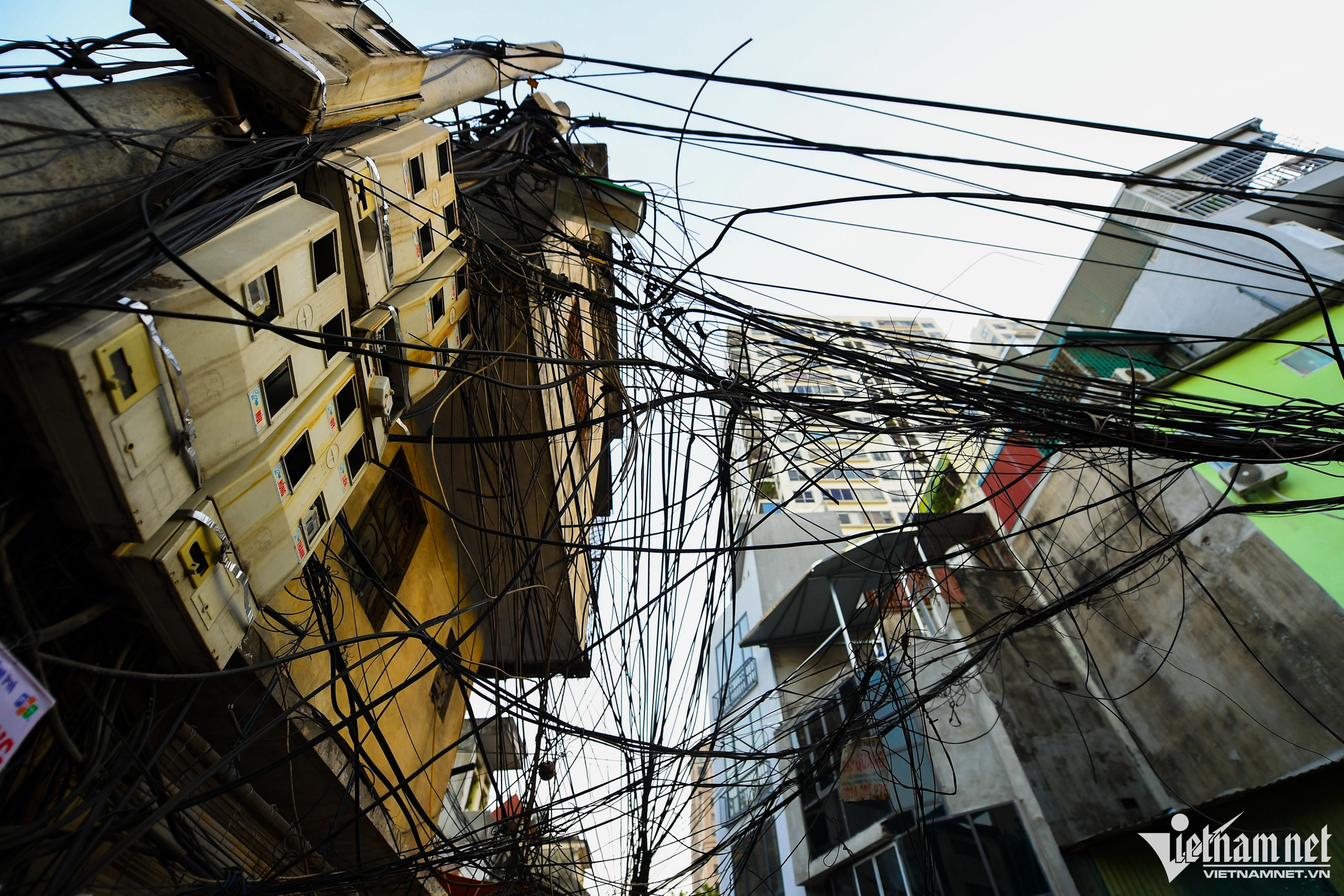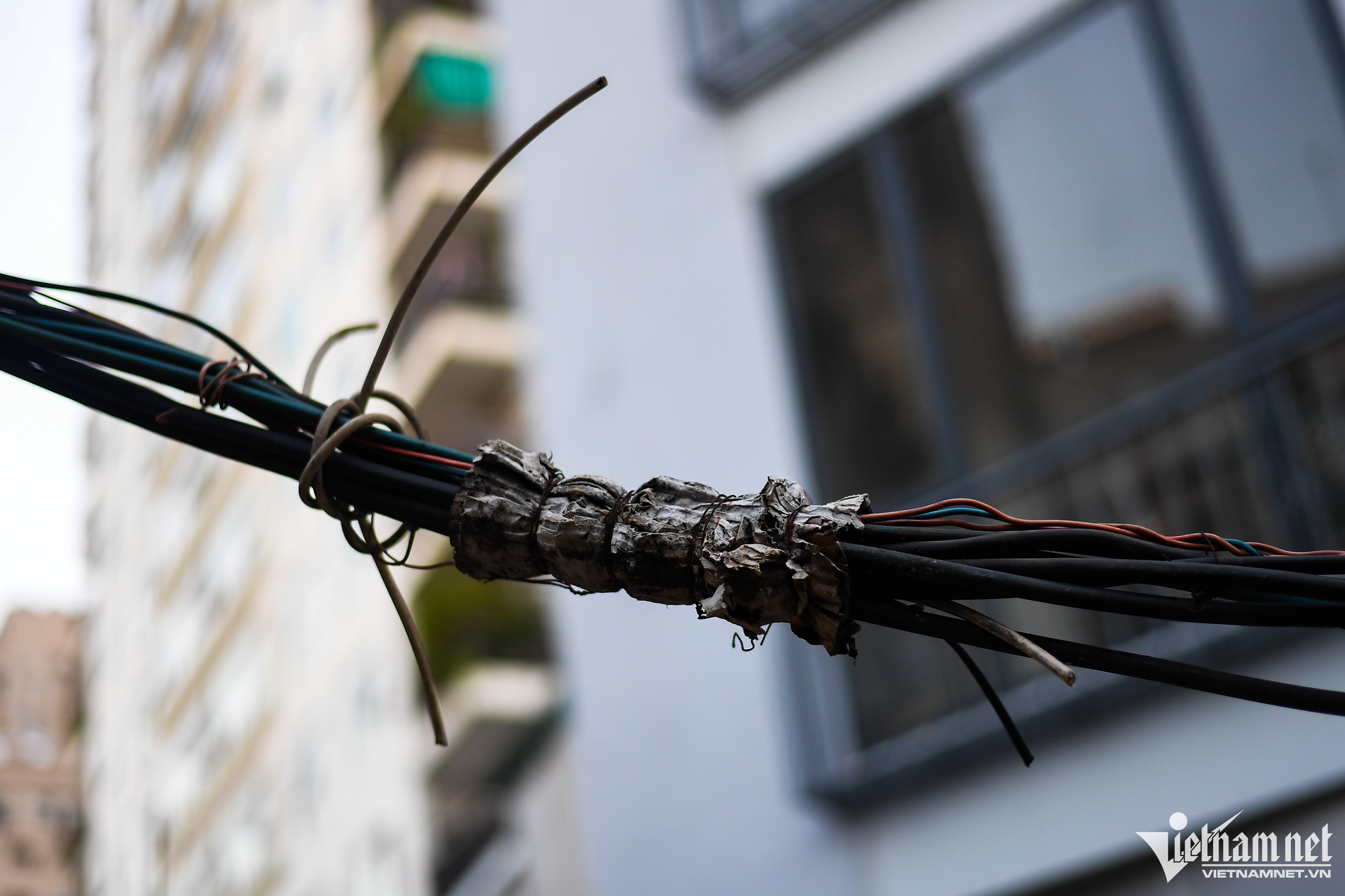 Nhiều đường dây được dùng vải cuốn xung quanh.Có bó dây võng xuống rất thấp, cách đầu người vài chục cm.