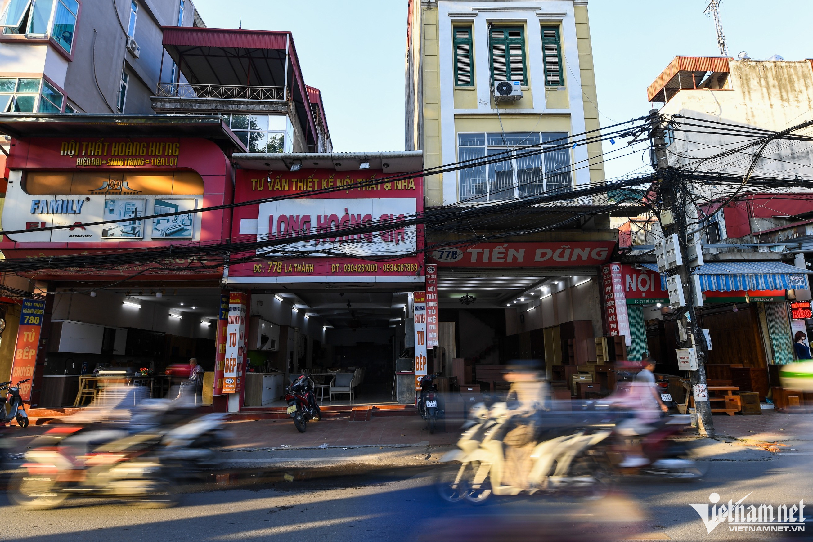 Đường dây võng xuống gần biển hiệu của các hộ kinh doanh đồ gỗ, đệm trên đường Đê La Thành (quận Đống Đa).