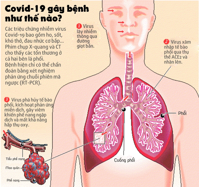 Virus được hít vào từ những giọt bắn của một người bị bệnh, khi họ ho hoặc hắt hơi. Từ đó, nó sẽ xâm nhập đường hô hấp của một người khỏe mạnh va tìm đến phổi. Ở phổi, Covid-19 mới tìm thấy tế bào mục tiêu của chúng.