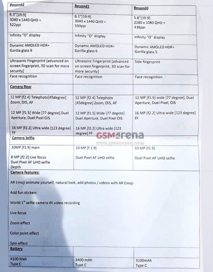 Mới đây, trang tin công nghệ GSM Arena đã được nguồn tin nội bộ trong chuỗi bán lẻ Samsung gửi bảng cấu hình chi tiết của bộ ba Galaxy S10 sắp ra mắt, bao gồm Galaxy S10, Galaxy S10e và Galaxy S10+. Dù chưa thể xác minh tính chính xác, chúng đều khớp với các tin đồn và rò rỉ trước đó.
