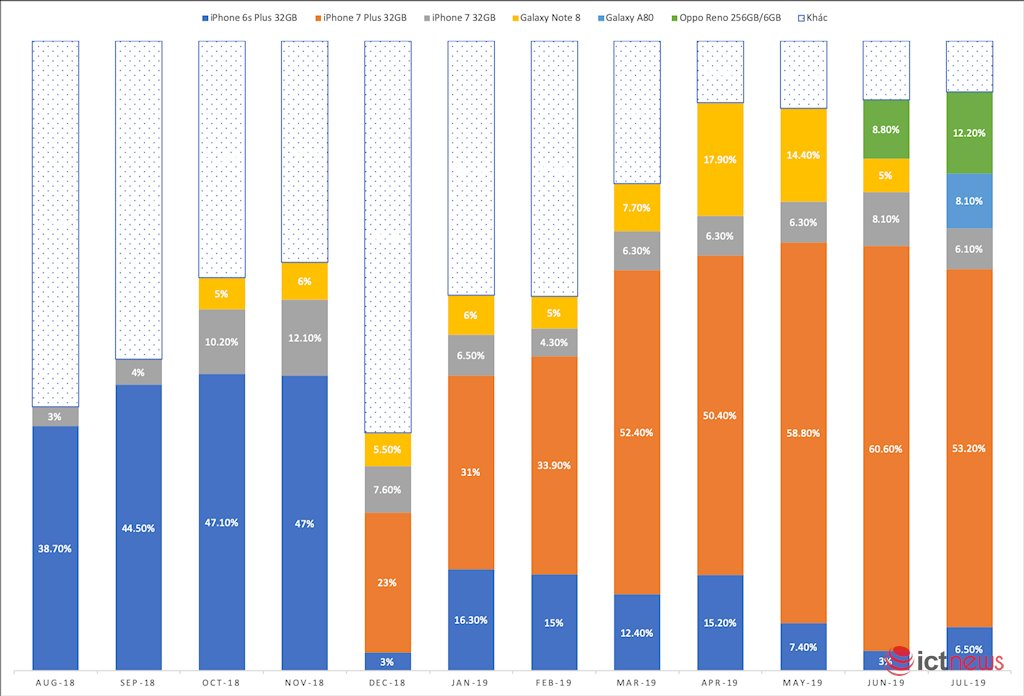 Vào tháng 6/2019 khi thị trường smartphone ở mức gần như thấp nhất với khoảng 37,5 ngàn máy bán ra (khá khiêm tốn so với “đỉnh cao” doanh số vào mùa mua sắm dịp Tết là tháng 1/2019 với hơn 87 ngàn máy) thì iPhone 7 Plus chiếm thị phần đến 60,6%. Kết quả này bỏ xa các đối thủ cùng phân khúc đến từ Samsung, Oppo và thậm chí kể cả những người anh em iPhone 6s Plus hay iPhone 7.