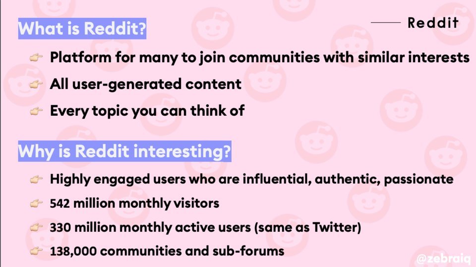 Reddit được ưa thích nhờ lượng người dùng trung thành, đam mê và độc đáo; sở hữu 542 triệu khách ghé thăm hàng tháng; 330 triệu người dùng tích cực; 138.000 cộng đồng và diễn đàn phụ. |