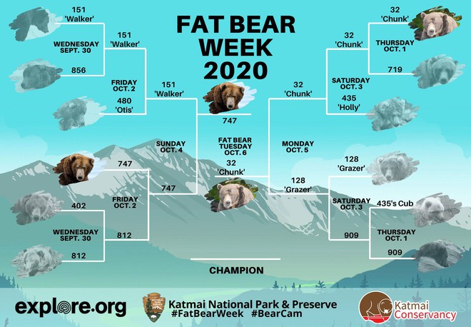 Trong tuần trước, người hâm mộ đã bỏ phiếu cho những chú gấu tham gia trong bảng đấu loại trực tiếp này. Đối đầu với vòng cuối cùng là 32 (hay còn gọi là Chunk) và 747, hai ứng cử viên vô cùng mạnh mẽ. Nhưng chỉ có một con gấu có thể được trao vương miện chiến thắng, và năm nay, 747 đã mang danh hiệu này về nhà một cách nặng nề nhất, khi đã tích lũy đủ chất béo để gần như tăng gấp đôi khối lượng của nó.