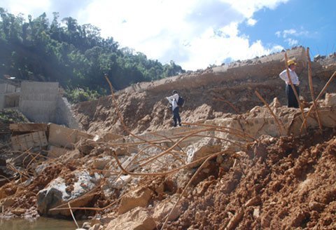 | Sập đổ tường thân đập tại công trình Thủy điện Đăk Mek 3. |