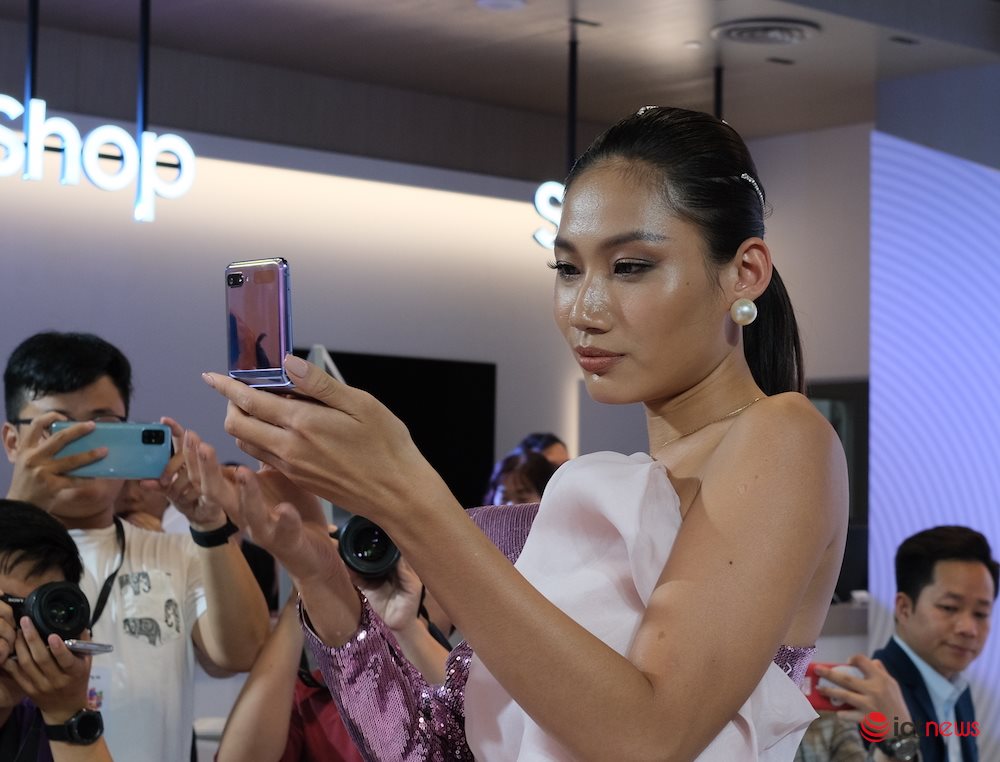 Người mẫu đang cầm trên tay chiếc điện thoại nắp gập Samsung Z Flip. Ảnh: Hải Đăng |