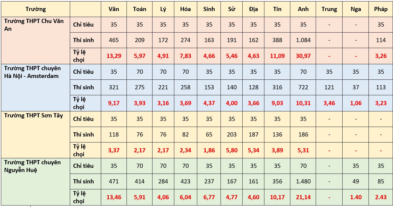 Trường THPT chuyên Nguyễn Huệ có số lượng thí sinh đăng ký dự thi đông nhất, trên 4.000 thí sinh. Sau đó là Trường THPT Chu Văn An với hơn 3.000 thí sinh, Trường THPT chuyên Hà Nội - Amsterdam với hơn 2.800 thí sinh, Trường THPT Sơn Tây với hơn 1.100.