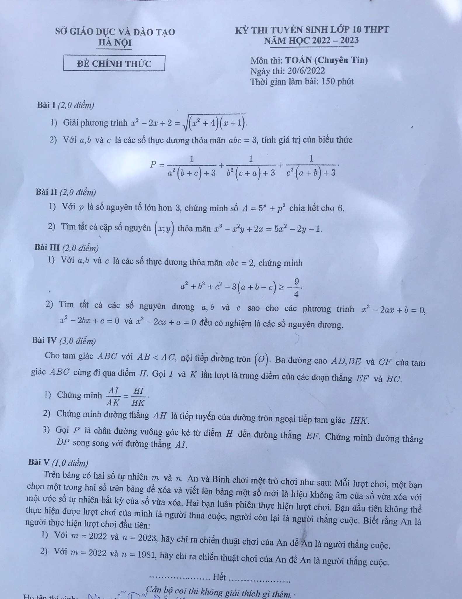 Gợi ý lời giải đề Toán thi lớp 10 chuyên Tin của Hà Nội năm 2022Sáng nay, thí sinh thi vào lớp 10 chuyên Tin học của các trường chuyên thuộc Sở GD-ĐT Hà Nội đã làm bài thi môn chuyên là môn Toán. Dưới đây là gợi ý lời giải đề Toán thi lớp 10 chuyên Tin của Hà Nội năm 2022.