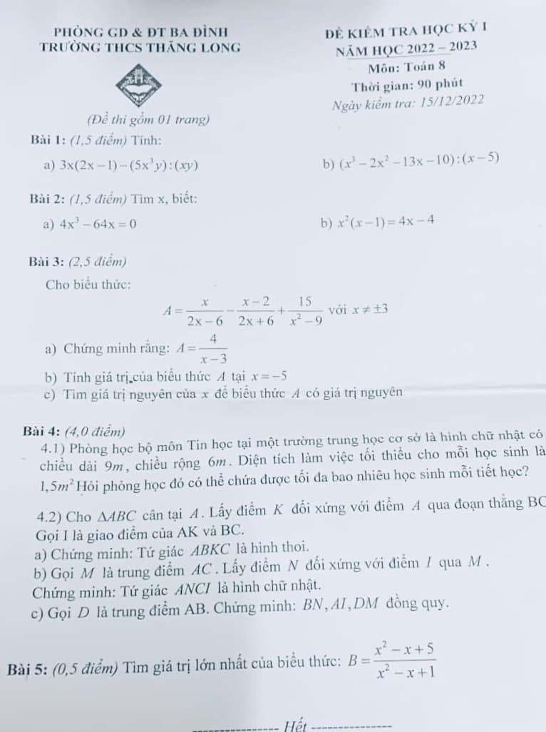 Học sinh lớp 8 ở Trường THCS Thăng Long vừa thực hiện bài kiểm tra học kỳ 1 môn Toán. Đề kiểm tra cụ thể như sau: