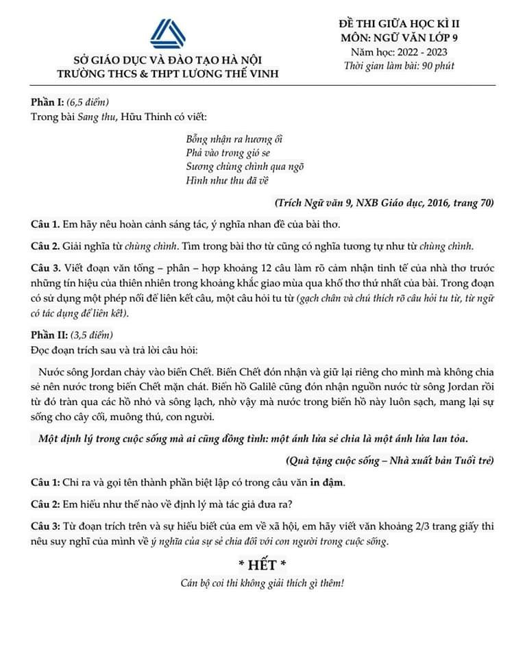 Dưới đây là đề kiểm tra môn Văn lớp 9 giữa học kỳ 2 năm học 2022 - 2023 Trường THCS và THPT Lương Thế Vinh (quận Cầu Giấy, Hà Nội):