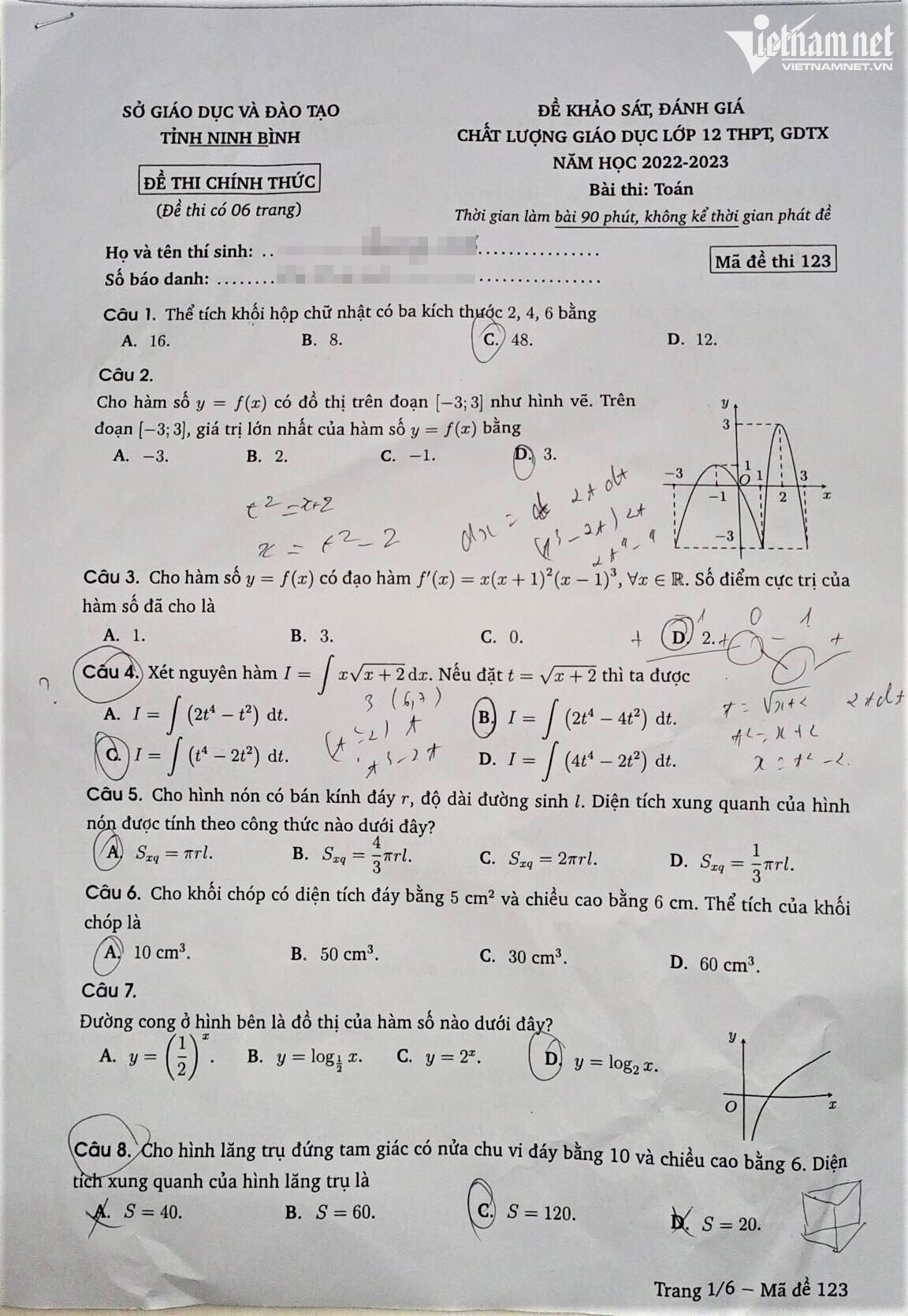 Dưới đây là đề thi thử tốt nghiệp THPT môn Toán cùng đáp án được Sở GD-ĐT Ninh Bình xây dựng để khảo sát chất lượng học sinh năm 2023 với thời gian làm bài 90 phút: