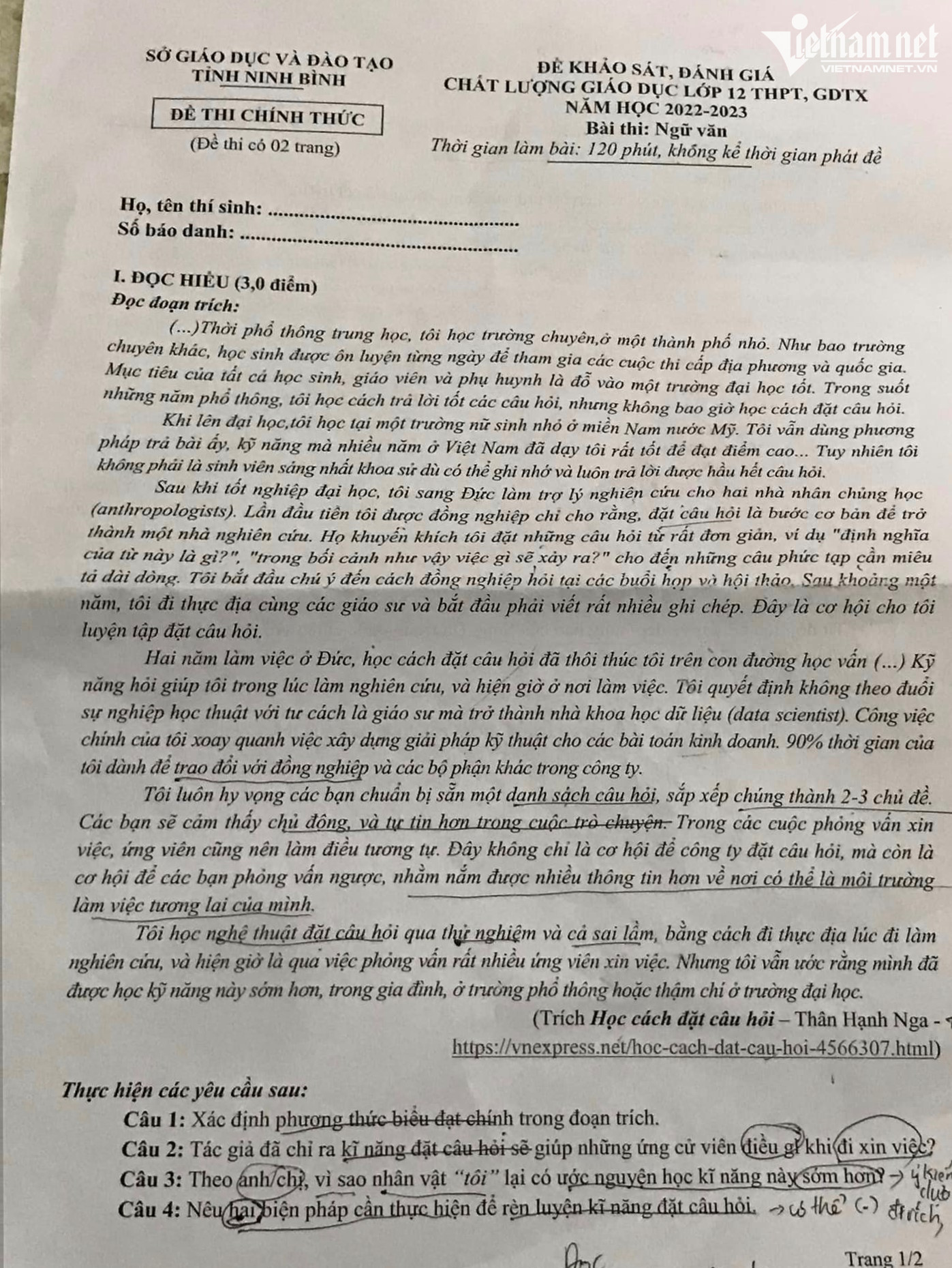 Dưới đây là đề thi thử tốt nghiệp THPT môn Ngữ văn cùng đáp án được Sở GD-ĐT Ninh Bình xây dựng để khảo sát chất lượng học sinh năm 2023 với thời gian làm bài 120 phút:
