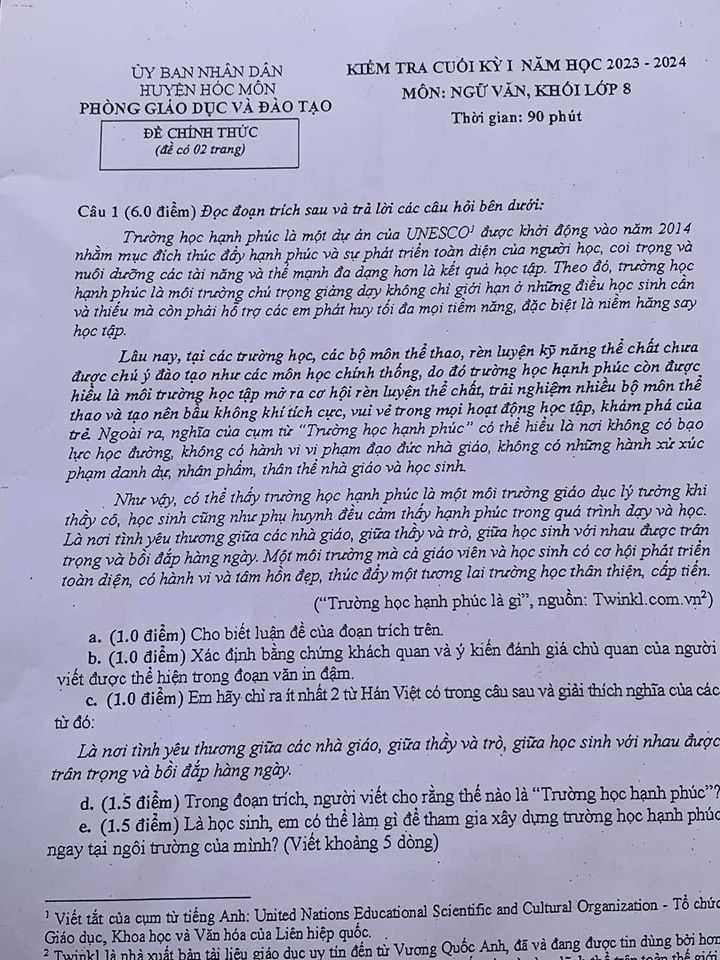 'Bí ẩn của làn nước' vào đề thi học kỳ 1 lớp 11 môn Ngữ văn VietNamNet giới thiệu đề kiểm tra cuối học kỳ 1 môn Ngữ văn khối lớp 11 của Trường THPT Võ Thị Sáu (TP.HCM).