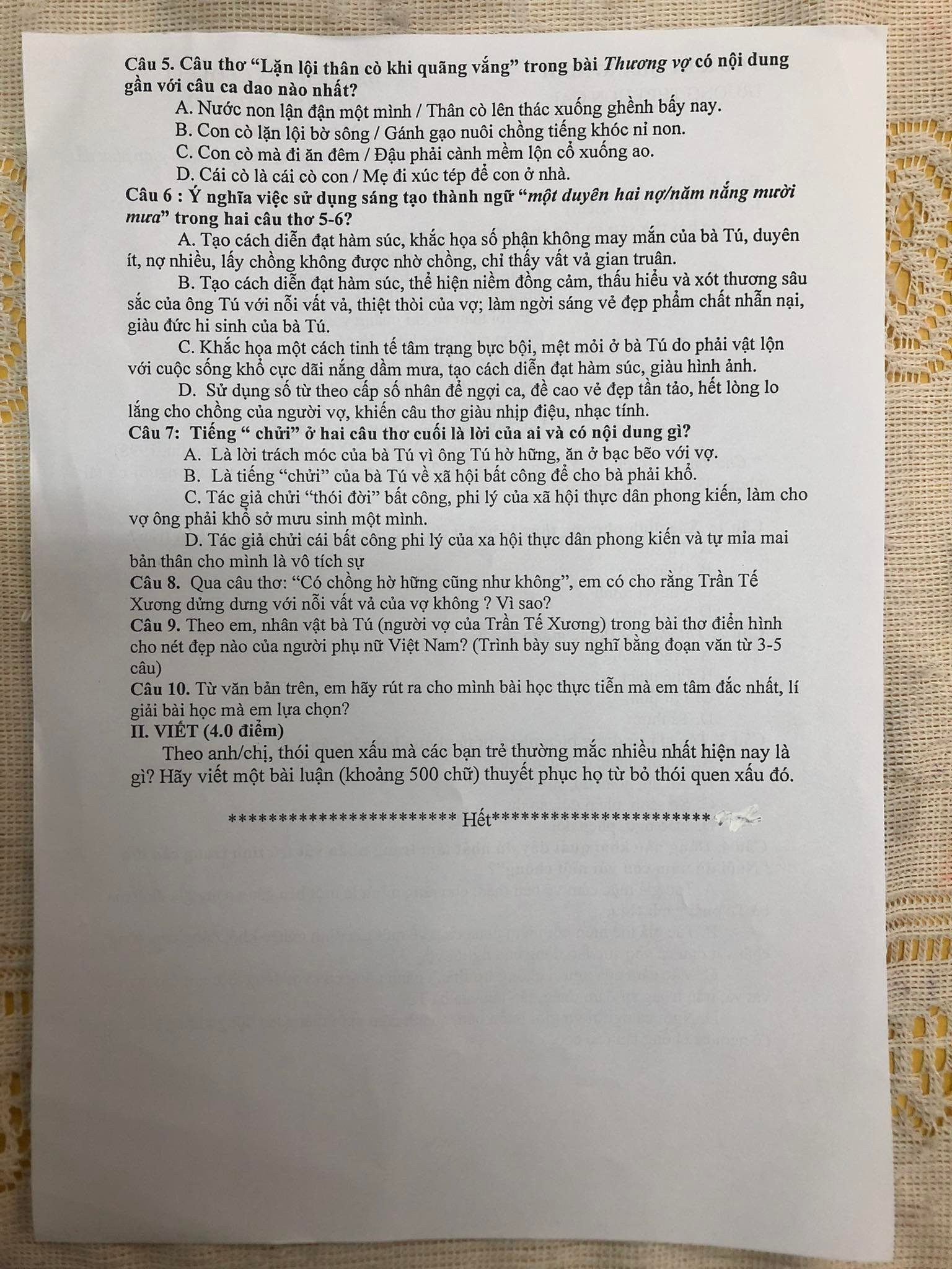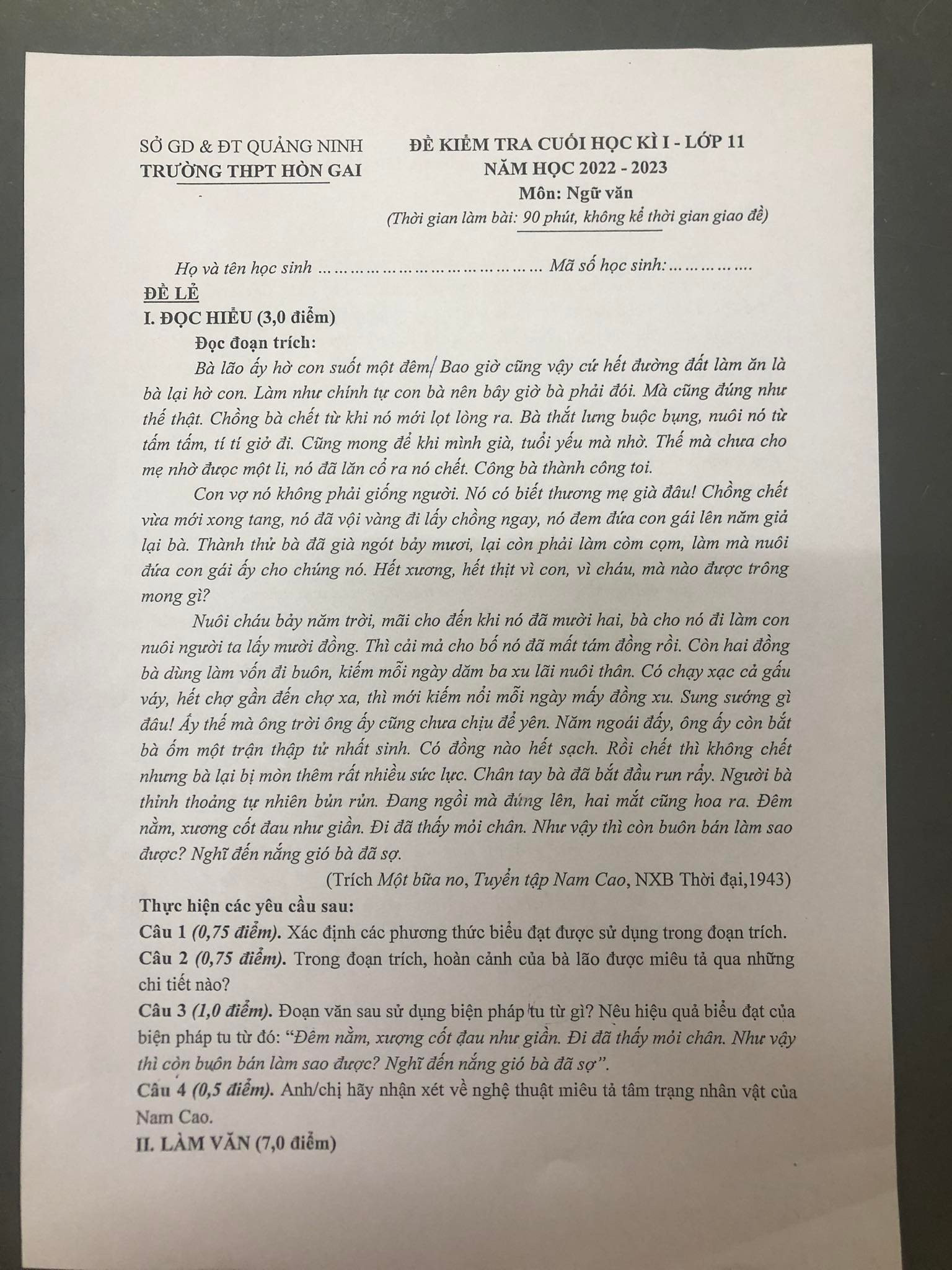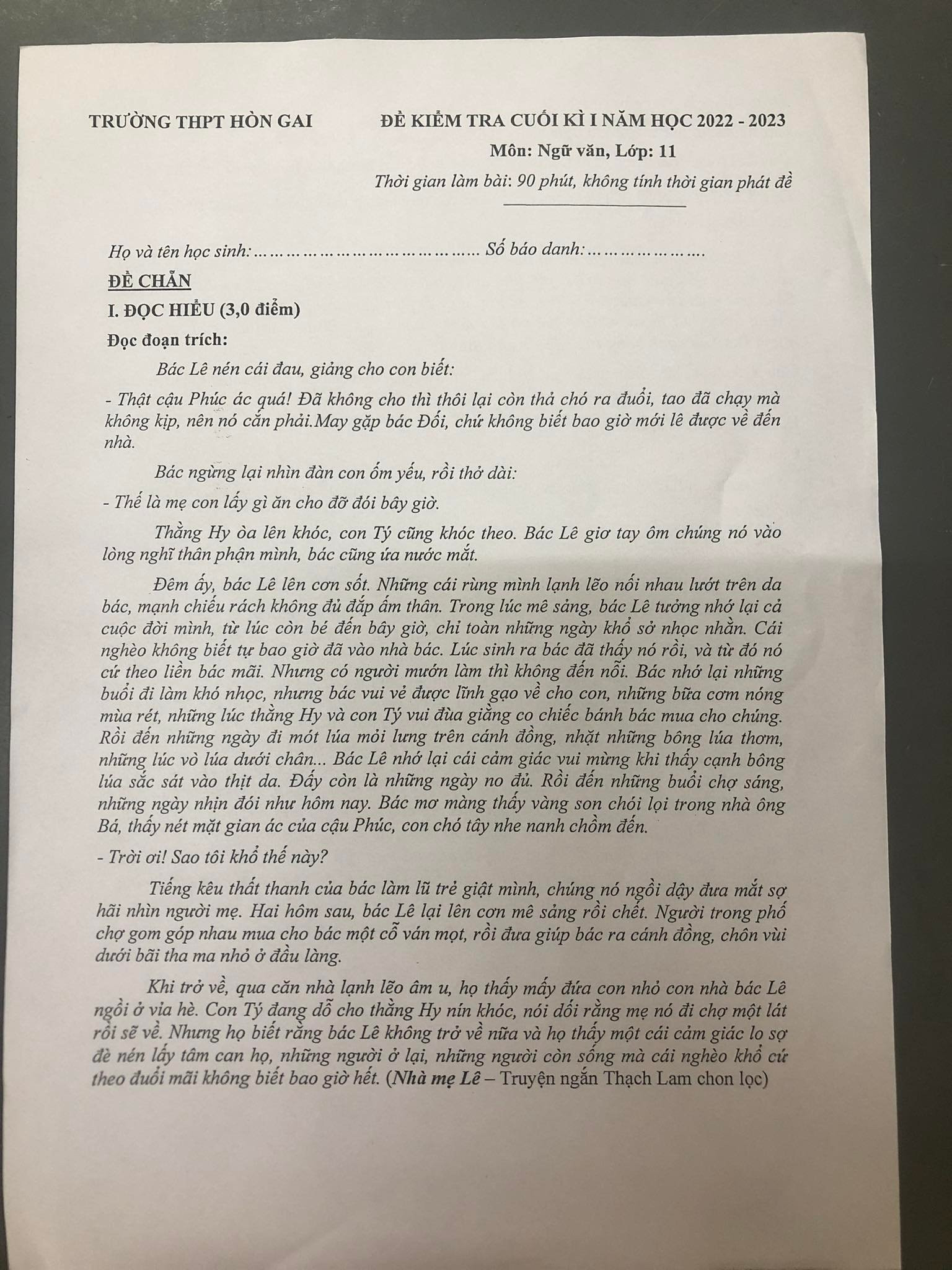 Học sinh lớp 10 và lớp 11 của Trường THPT Hòn Gai, TP Hạ Long, Quảng Ninh vừa có bài kiểm tra học kỳ 1 môn Ngữ văn. Có 2 mã đề được ký hiệu là đề chẵn và đề lẻ.