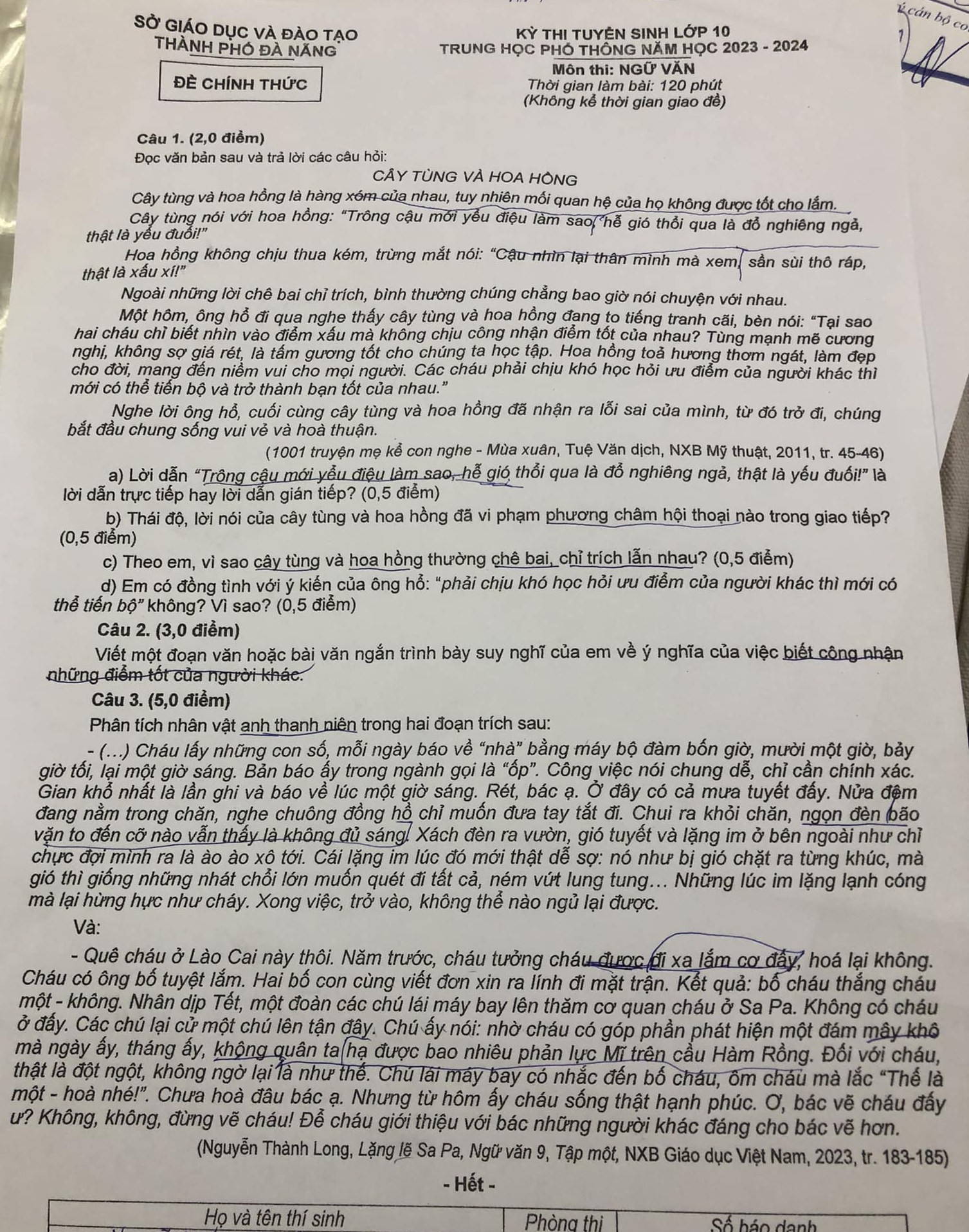 Tại TP Đà Nẵng, đề thi năm nay với 3 câu hỏi. Câu hỏi được nhiều người đánh giá khá hay là câu nghị luận xã hội suy nghĩ của em về ý nghĩa của việc biết công nhận những điểm tốt của người khác.