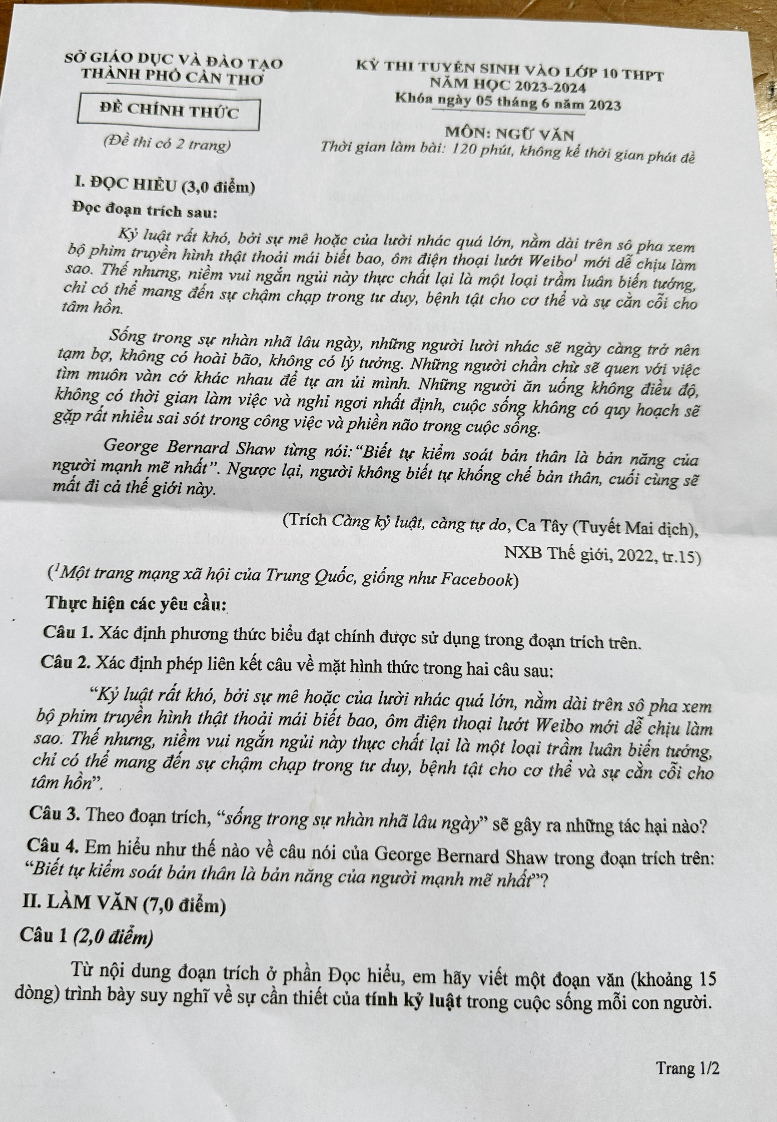 Dưới đây là đề thi môn Ngữ văn vào lớp 10 năm 2023 do Sở GD-ĐT TP Cần Thơ ra: