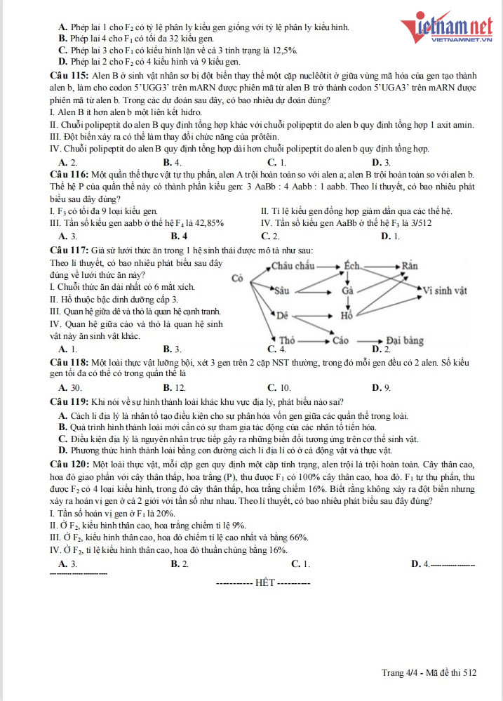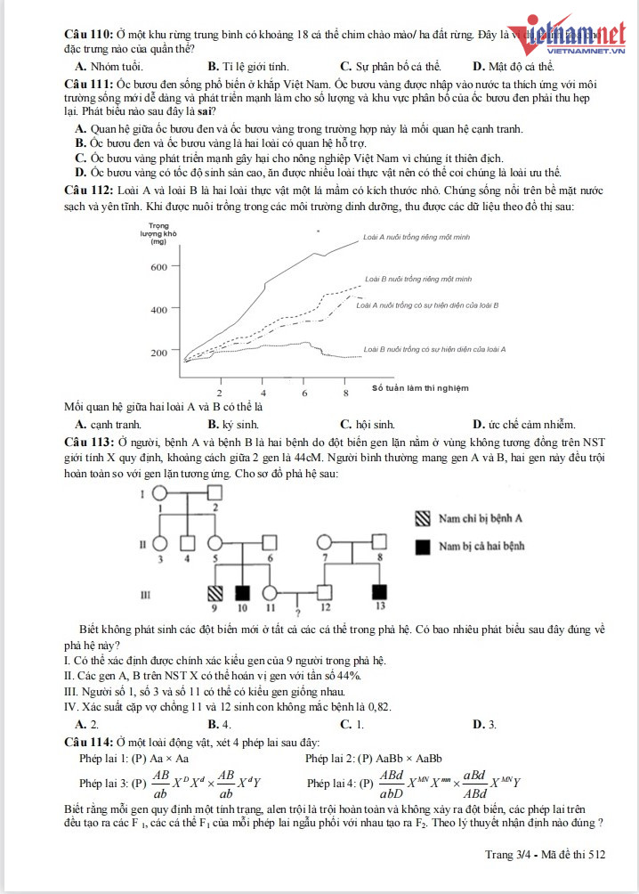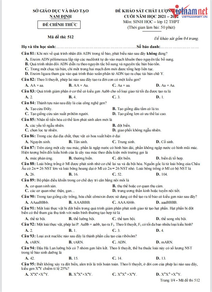 Dưới đây là đề thi thử tốt nghiệp THPT môn Sinh học cùng đáp án được Sở GD-ĐT Nam Định xây dựng để khảo sát chất lượng học sinh năm 2022: