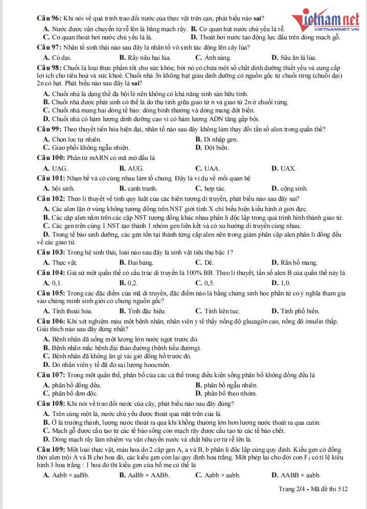 Đáp án tham khảo môn Sinh học thi tốt nghiệp THPT năm 2024 - 24 mã đề