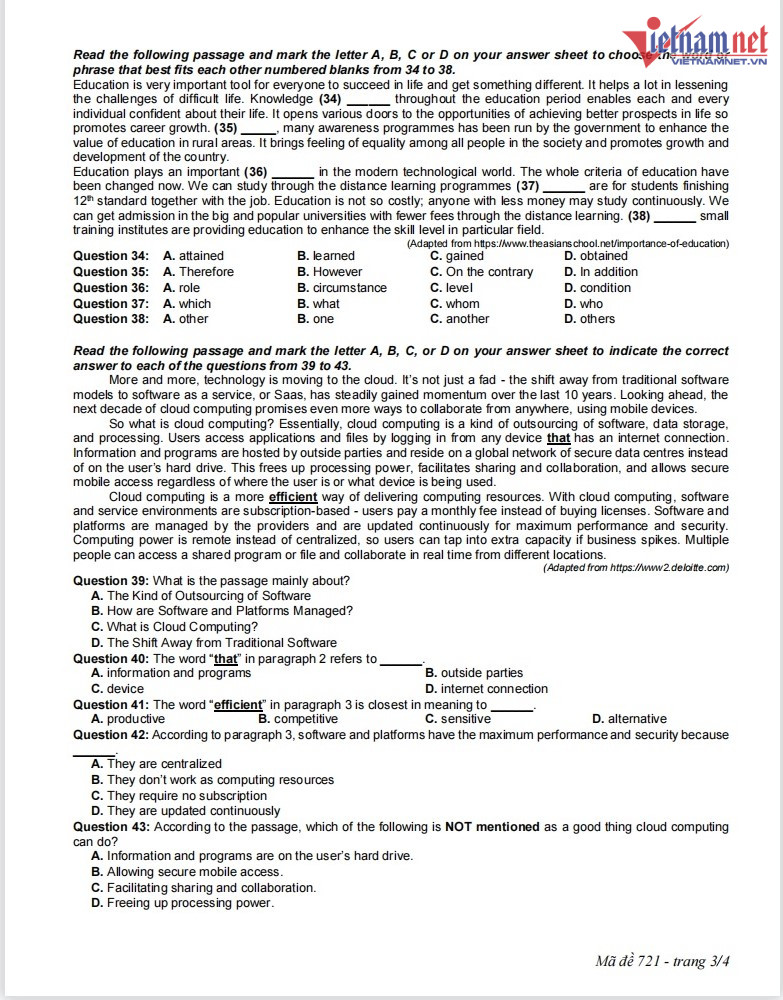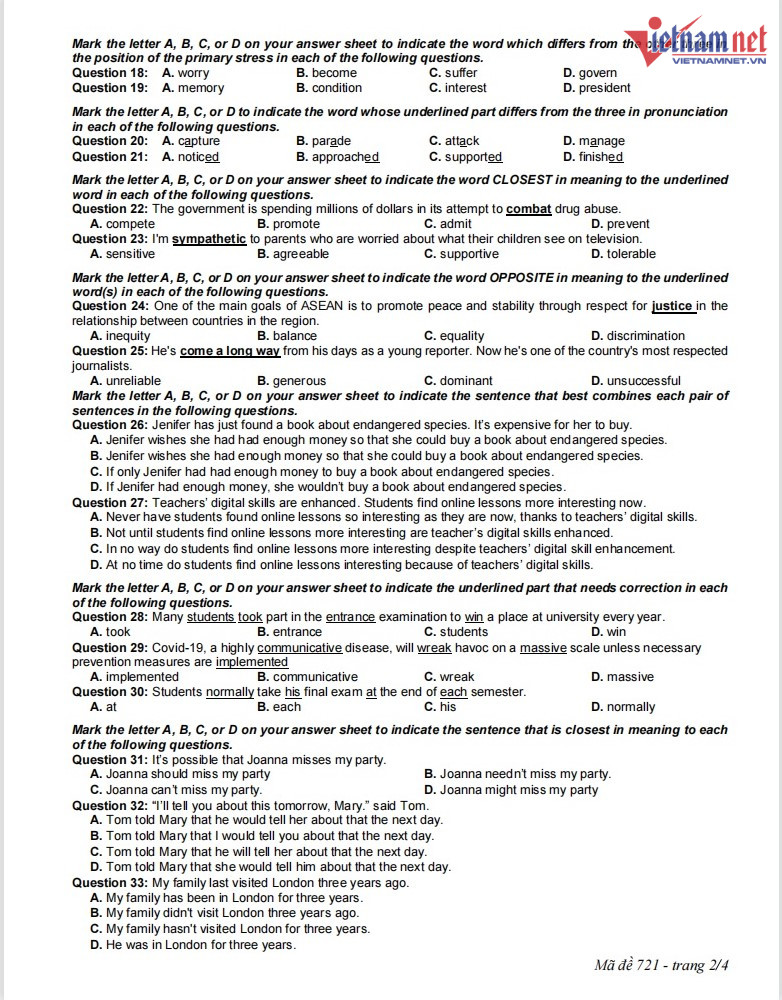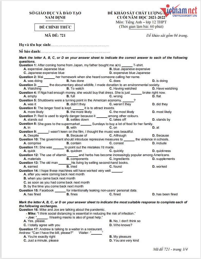 Dưới đây là đề thi thử tốt nghiệp THPT môn Tiếng Anh cùng đáp án được Sở GD-ĐT Nam Định xây dựng để khảo sát chất lượng học sinh năm 2022: