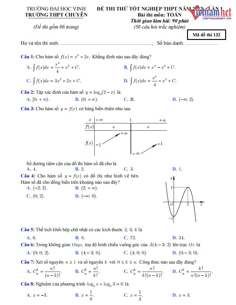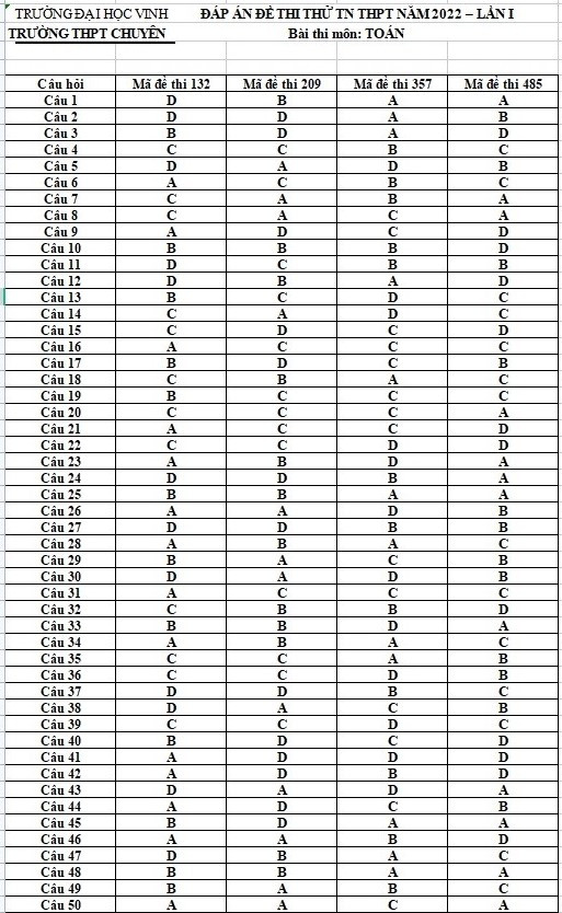 Dưới đây là đề Toán ở kỳ thi thử tốt nghiệp THPT năm 2022 với 50 câu trong vòng 90 phút mà Trường THPT Chuyên Đại học Vinh xây dựng: