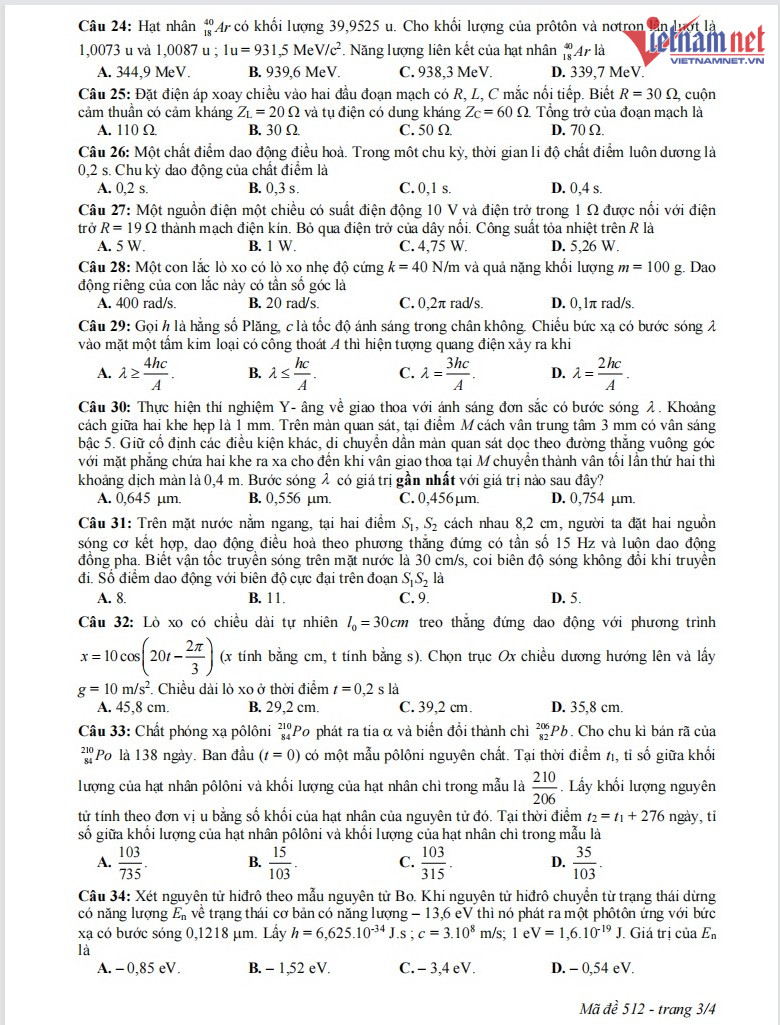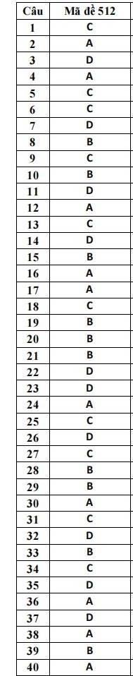 Đáp án của các đề thi thử tốt nghiệp THPT môn Vật lý của Nam Định như sau: