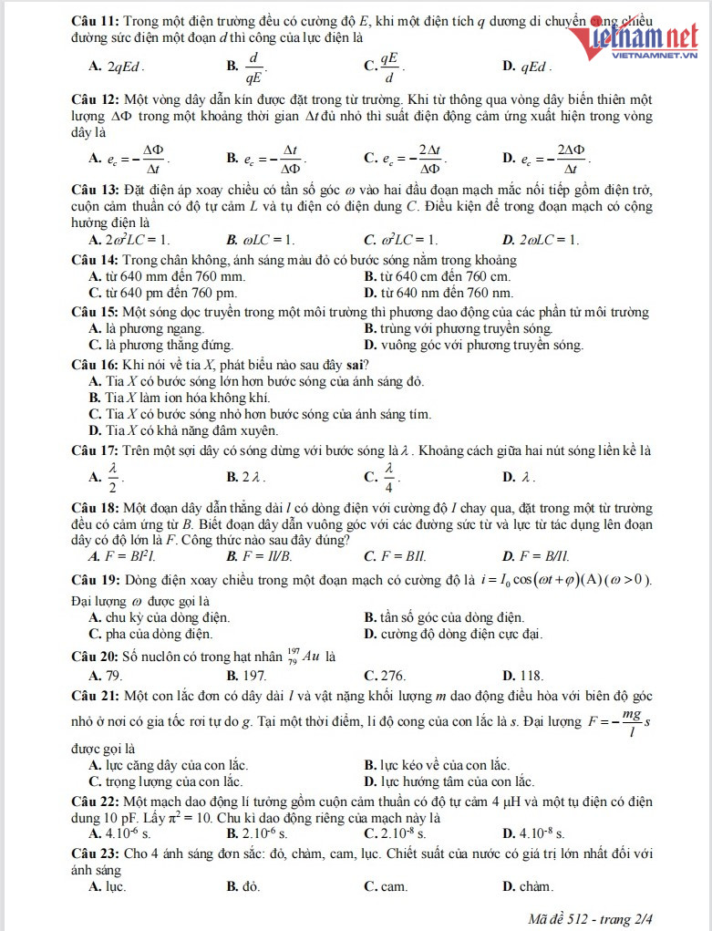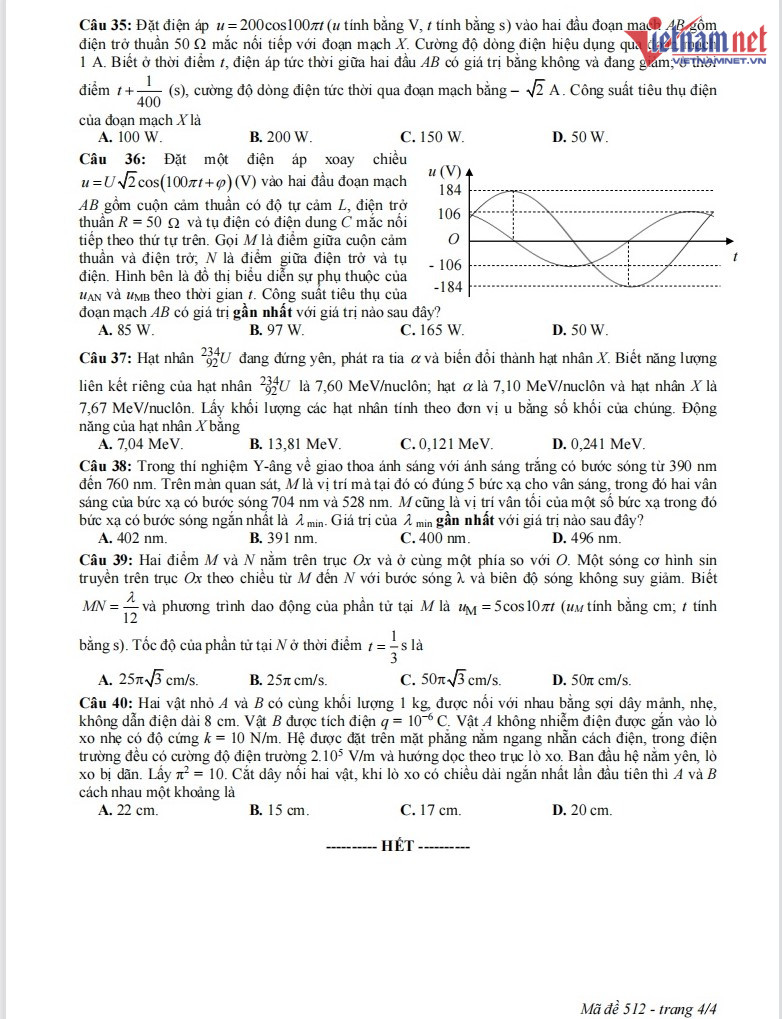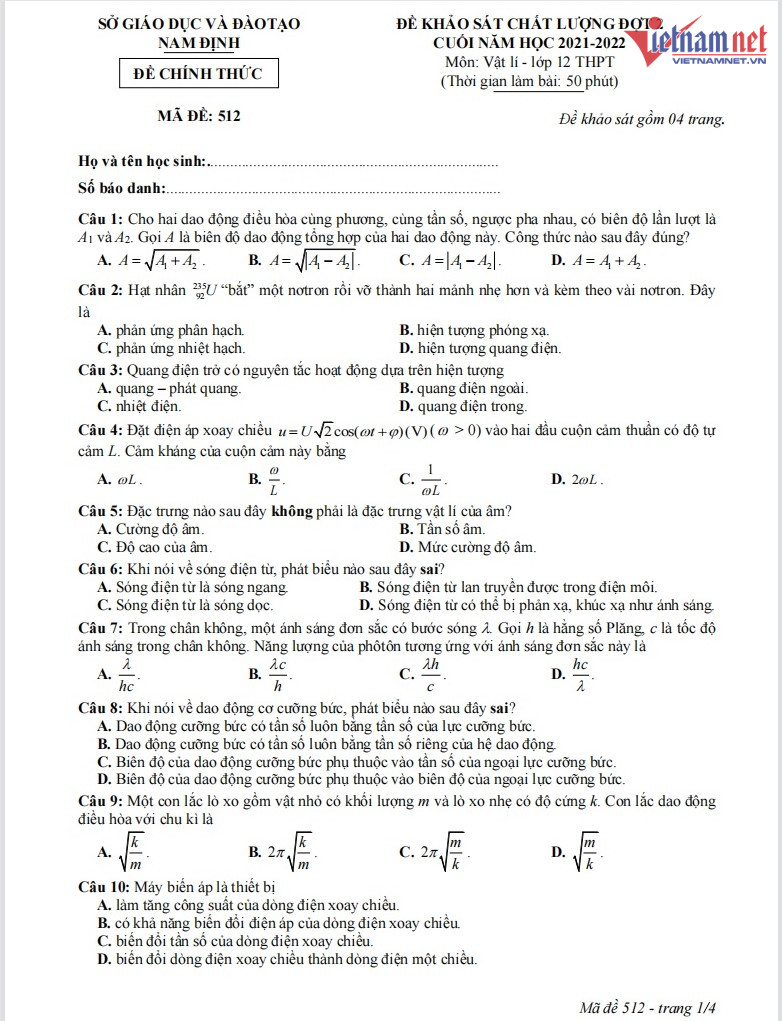 Dưới đây là đề thi thử tốt nghiệp THPT môn Vật lý được Sở GD-ĐT Nam Định xây dựng để khảo sát chất lượng học sinh năm 2022: