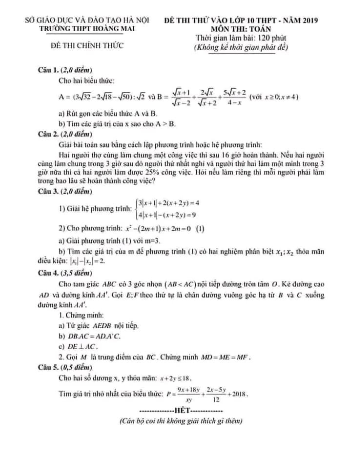 Dưới đây là đề thi thử môn Toán Trường THPT Hoàng Mai (Hà Nội) thí sinh có thể tham khảo: