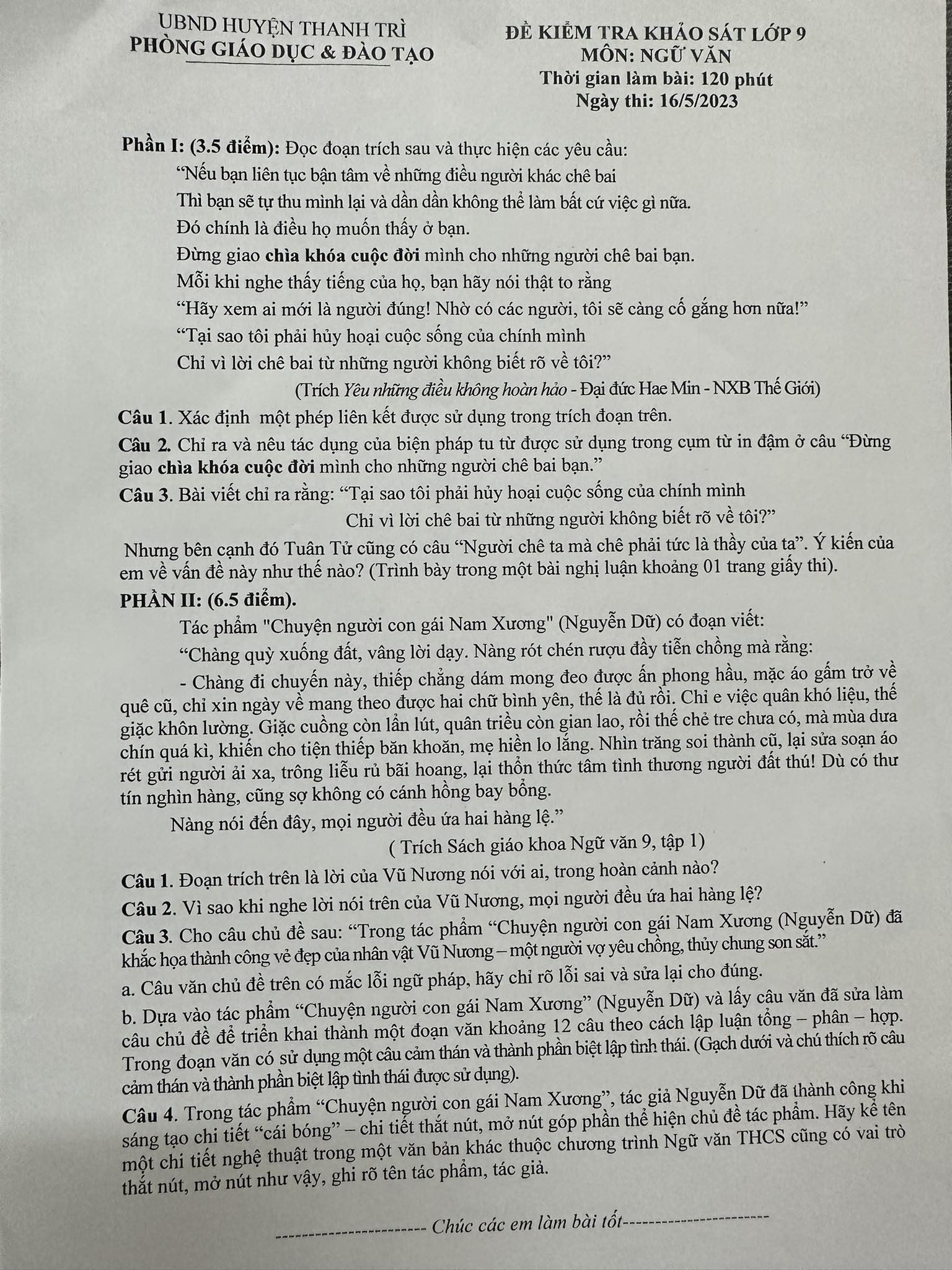 Dưới đây là đề thi thử vào lớp 10 môn Văn mô phỏng theo dạng đề thi vào lớp 10 những năm trước ở Hà Nội do Phòng GD-ĐT huyện Thanh Trì xây dựng: