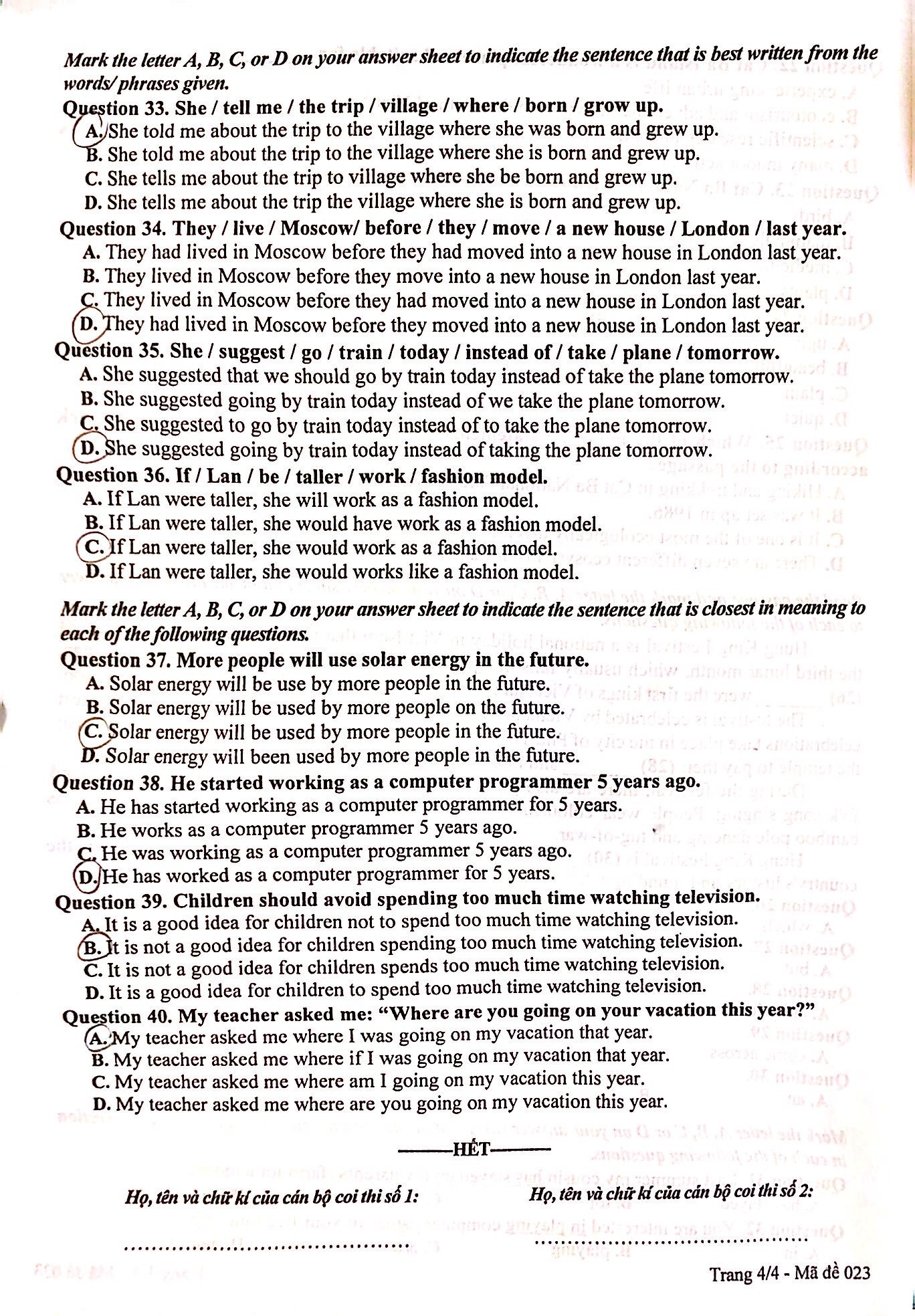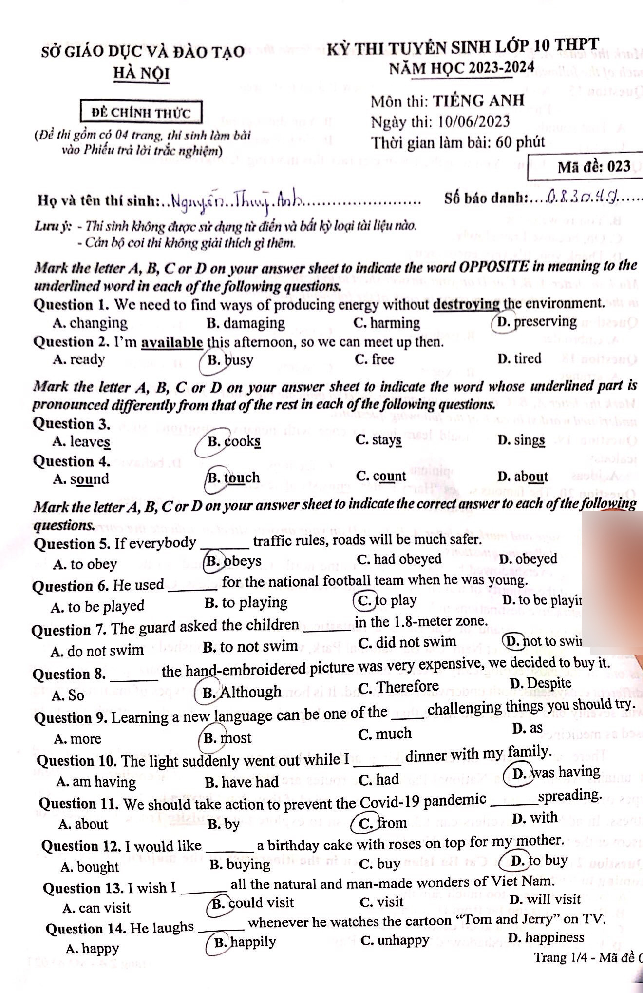 Đáp án gợi ý môn Tiếng Anh thi lớp 10 ở Hà Nội năm 2023