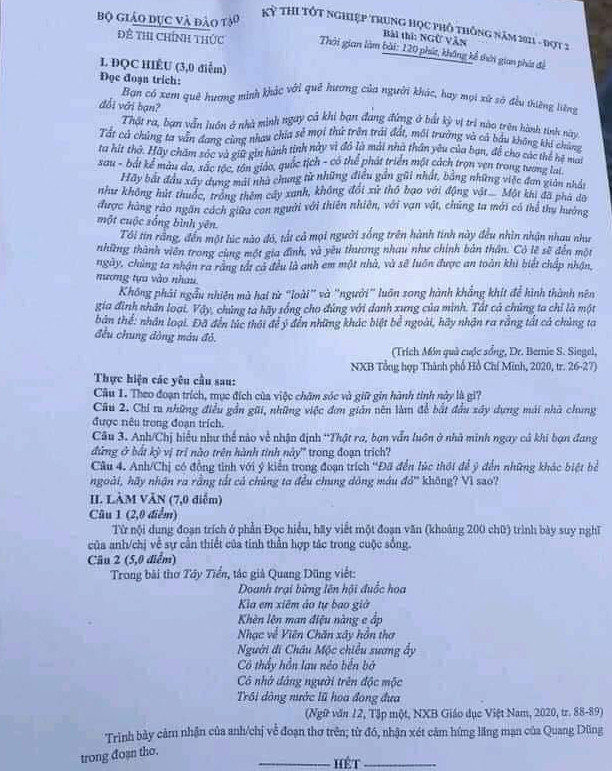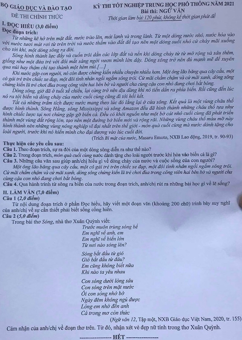 Kỳ thi tốt nghiệp THPT năm 2021 cũng được tổ chức thành 2 đợt do ảnh hưởng của dịch Covid-19. Đề thi của môn Ngữ văn trong hai đợt thi như sau: