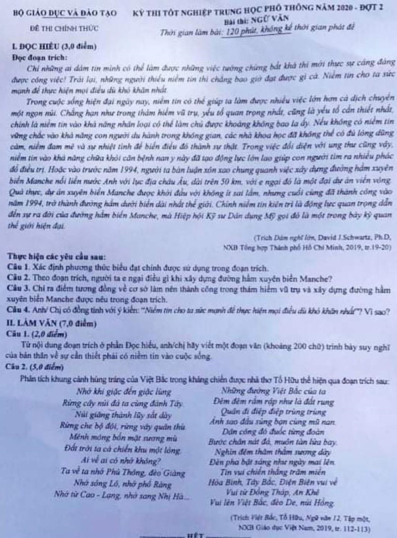 Do ảnh hưởng của dịch Covid-19, kỳ thi được tổ chức thành 2 đợt. Sau đây là đề Ngữ văn thi tốt nghiệp THPT năm 2020 đợt 1 và đợt 2.