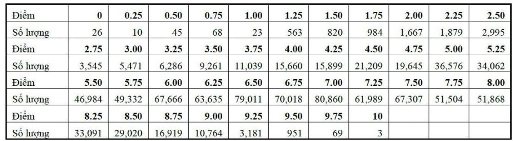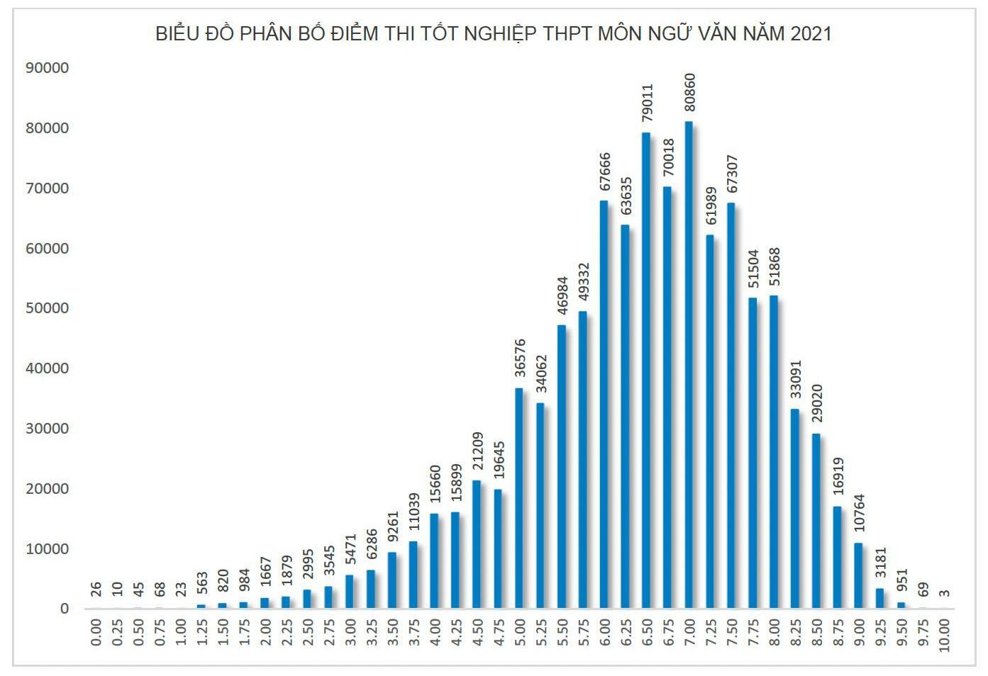 Kết quả phân tích phổ điểm thi tốt nghiệp THPT môn Ngữ văn của cả nước năm 2021 cho thấy: Có 978.027 thí sinh tham gia thi bài thi Ngữ văn trong đó điểm trung bình là 6,47 điểm, điểm trung vị là 6,5 điểm; điểm số có nhiều thí sinh đạt nhất là 7 điểm. Số thí sinh có điểm <= 1 là 172 (chiếm tỷ lệ 0.02%); số thí sinh đạt điểm dưới trung bình là 117.915 (chiếm tỷ lệ 12,06%).