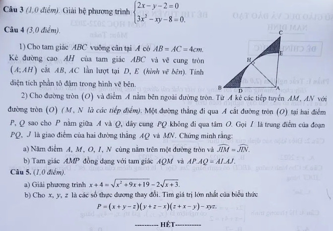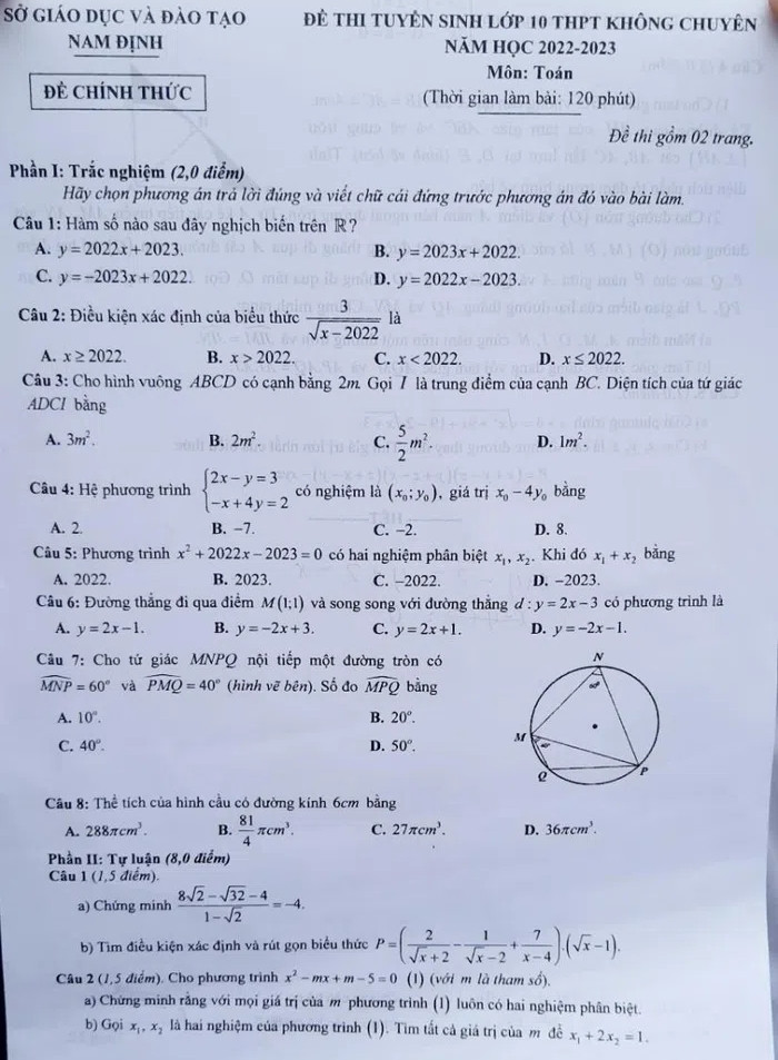 Đề thi môn Toán lớp 10 năm 2022 của Nam Định như sau: