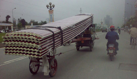 | Xe ba gác vẫn ngang nhiên chở hàng cồng kềnh trên đường Nguyễn Văn Cừ (Ảnh Gia Văn). |