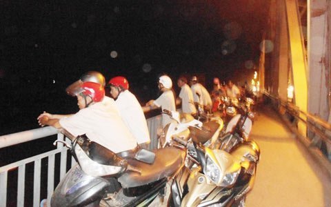 | Nhiều người hiếu kỳ đứng xem trên cầu. |