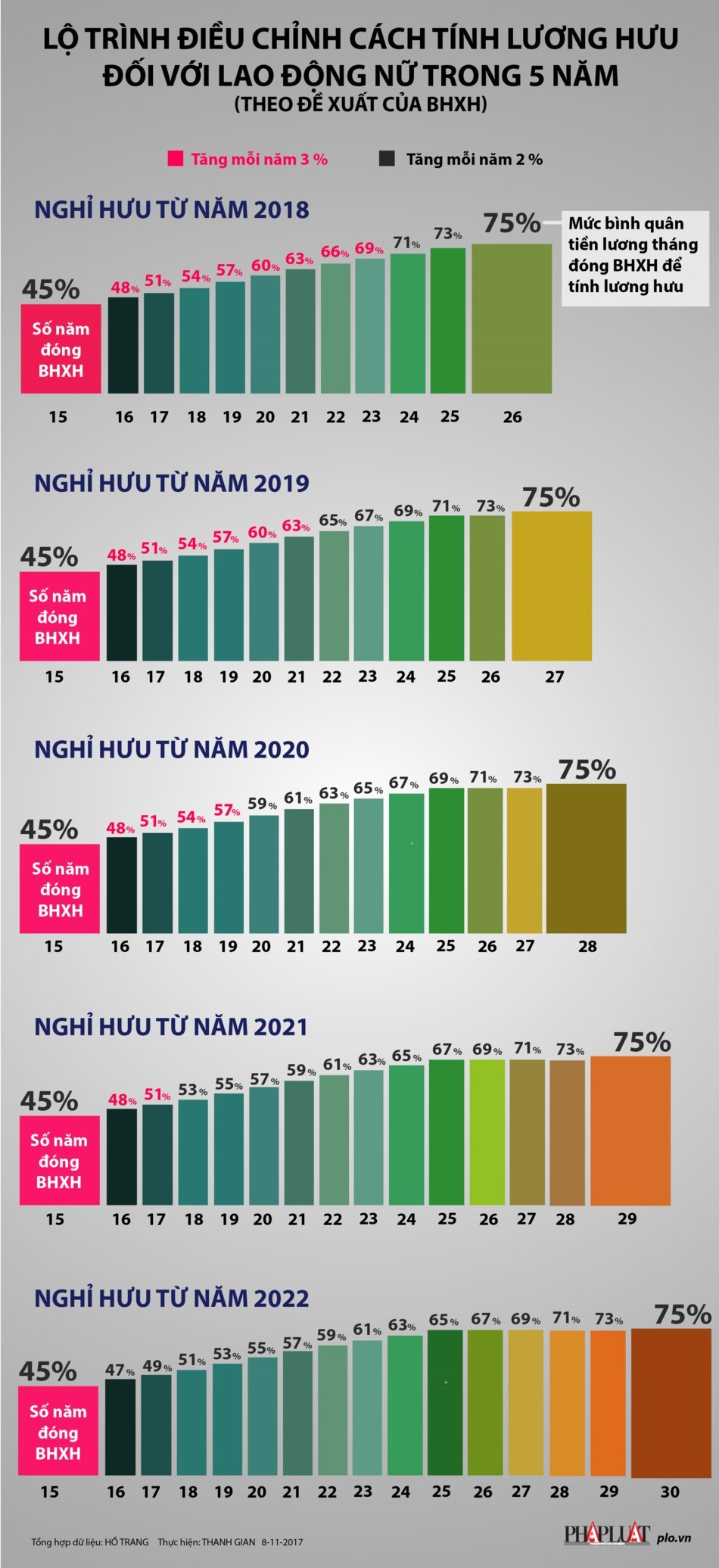 Lộ trình điều chỉnh cách tính lương hưu đối với lao động nữ trong 5 năm từ 2018 - 2022 (theo đề xuất của BHXH).