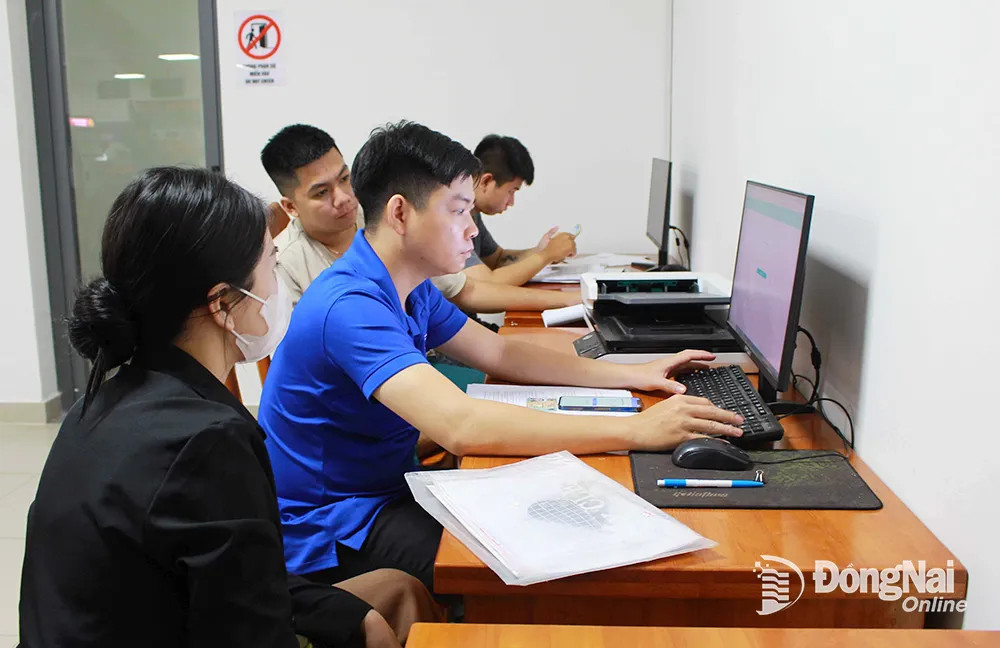 | Cán bộ, đoàn viên thanh niên huyện Long Thành hỗ trợ người dân thực hiện dịch vụ công trực tuyến tại bộ phận một của huyện Long Thành. Ảnh: H.Thảo |