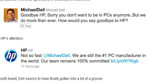 Tuy nhiên, với tính cách nhã nhặn và bình lặng của mình, Michael Dell, người sáng lập kiêm Chủ tịch/Giám đốc điều hành của Dell chưa từng góp mặt trong danh sách đó. Ấy thế mà vụ việc HP chia tay mảng PC một cách đình đám hồi giữa tuần qua cũng đã khiến Dell không thể cưỡng lại sự cám dỗ của việc bình luận. Ngay sau quả bom mà HP ném ra, Dell đã viết trên Twitter: