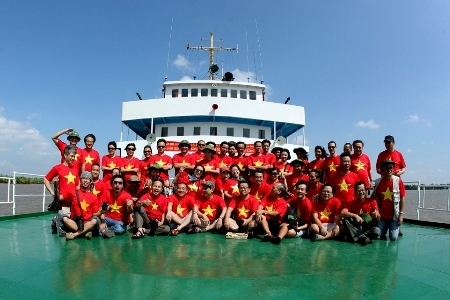 Thực ra là chưa mà thôi, ra biển thì mới biết mặt nhau ngay. Biết trước là lát nữa mọi người sẽ rất xấu xí, tôi yêu cầu cả đoàn thay đồng phục áo phông cờ đỏ sao vàng để lên boong chụp ảnh lưu niệm cho đẹp.