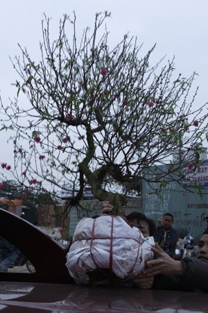 Một người may mắn mua được cây đào đẹp với giá rẻ bất ngờ. Ảnh: Việt Anh