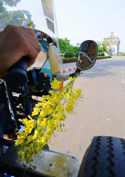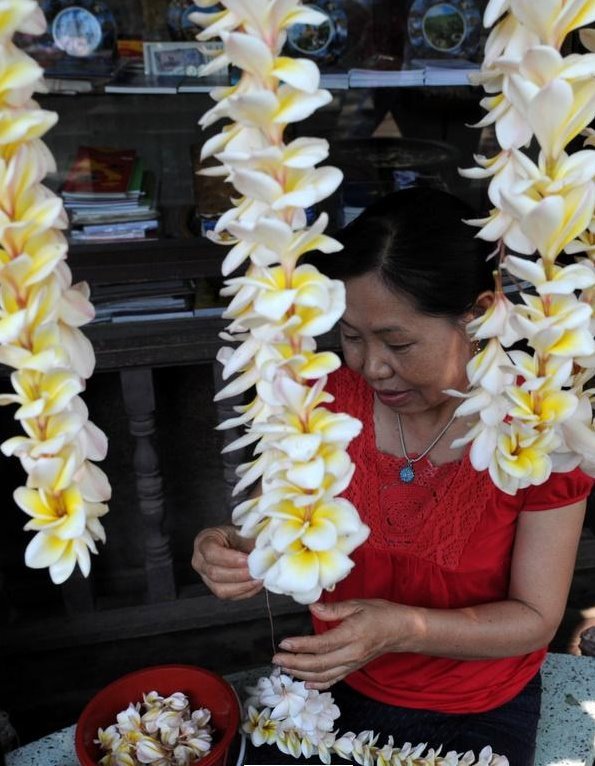 Ngày Tết không thể thiếu hoa 2 loài hoa phổ biến đó là hoa Chăm pa và hoa Muồng vàng. Hoa Chăm pa thì được kết vòng đeo cổ hoặc cài lên tóc, còn hoa muồng vàng được treo khắp nơi, thậm chí trên cửa kính ôtô, xe máy hay cả xe lam để mong gặp may mắn trong năm mới (Ảnh:Lekimahung - phuot.com) |