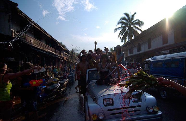 Bun Pi May có tiến hành nghi lễ rước nàng Xẳng Khản - nàng Chúa Xuân. Ðặc trưng lớn nhất và cũng là dấu ấn cổ xưa nhất của Bun Pi Mày thể hiện ở tập tục té nước, tiếng Lào gọi là "hốt nậm" (Ảnh:Lekimahung - phuot.com) |
