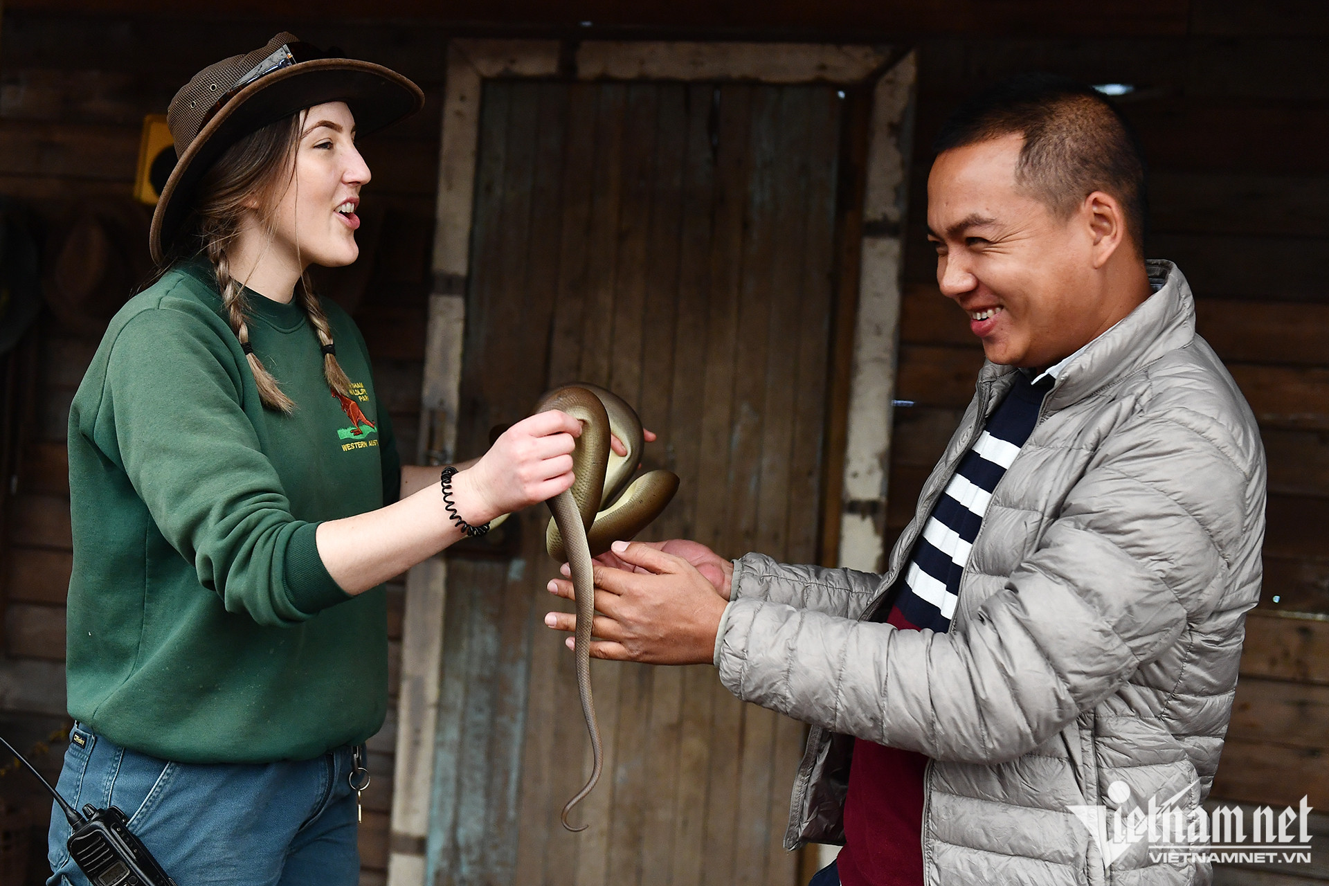 Một du khách Việt Nam được nhân viên mời cầm thử con rắn trong tay.