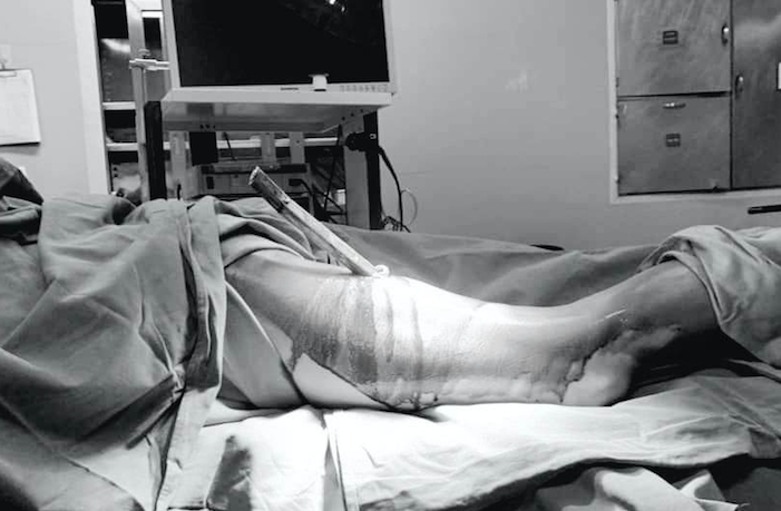 Khi đưa đến viện, bác sĩ nhận thấy dị vật gây tổn thương gân cơ và huyết khối tĩnh mạch đùi sâu, vị trí 1/3 dưới. Cuộc phẫu thuật nhanh chóng được tiến hành ngay lúc nửa đêm.