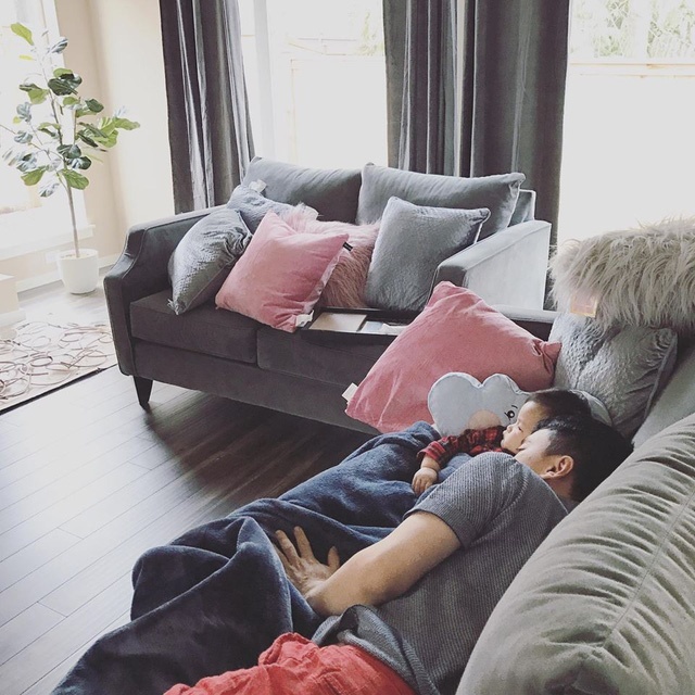 Mặc dù có diện tích khiêm tốn hơn nhà của Đan Trường nhưng vẫn đủ rộng rãi để bố trí nội thất tiện nghi. Phòng khách được bài trí ấm cúng với tông màu trắng xám.