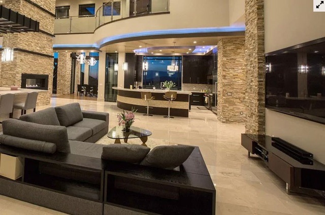 Phòng khách rộng lớn với trần cao và quầy bar ngay bên cạnh.
